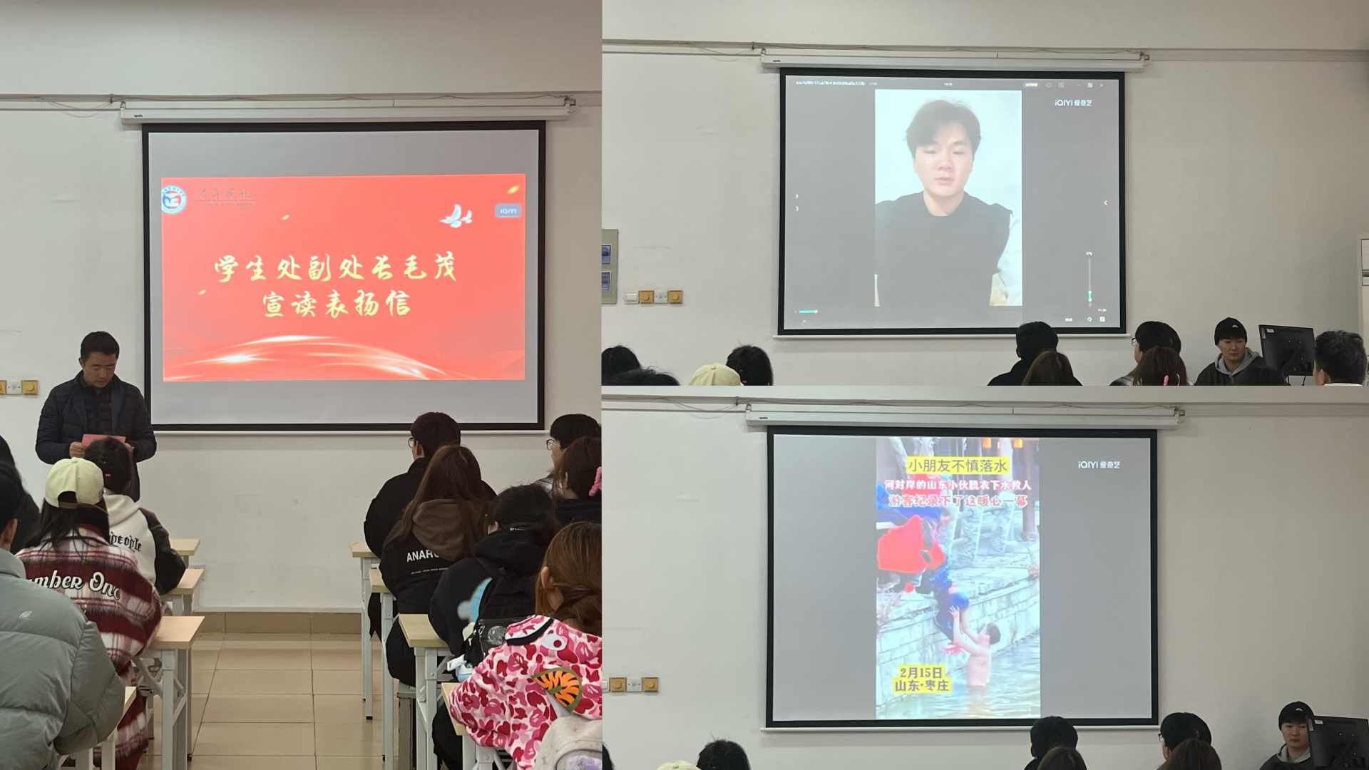 首先,由查理介绍赵子明勇救落水儿童先进事迹。之后,由学生处副处长毛茂宣读表扬信。对赵子明同学在保证自身安全前提下,见义勇为的行为给予高度赞扬。随后,在赵子明同学进行线上视频分享时,赵子明表示:“我时常问我自己什么是真、善、勇?看到正义的事,就勇敢的去做。经历过后我认识到见义勇为就是一种真、善、勇,我只是做了一件应该做的、值得做的事,却得到了这么多关心、褒奖,这既是一种鼓励,也是一种鞭策。”