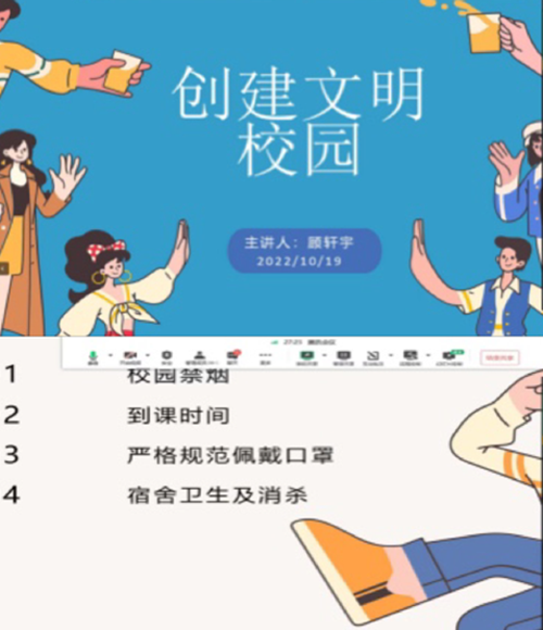 组织创建文明校园班会,辅导员认真为同学们讲解建设优良学风,创建文明校园的必要性。从禁烟、宿舍卫生、课堂秩序、日常行为习惯养成等方面提要求,引导学生养成文明好学的主观意识。