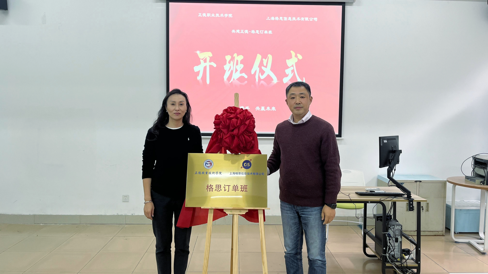 12月8日下午,色情视频 与上海格思信息技术有限公司(以下简称上海格思)共建的“格思订单班”揭牌仪式在5109D教室隆重举行。上海格思装配中心副主任、中国科学院“科苑名匠”许国平、热控产品事业部汪珏、人力资源部梁蒙蒙以及学院相关部门领导、订单班学生代表一同参加此次揭牌仪式。
