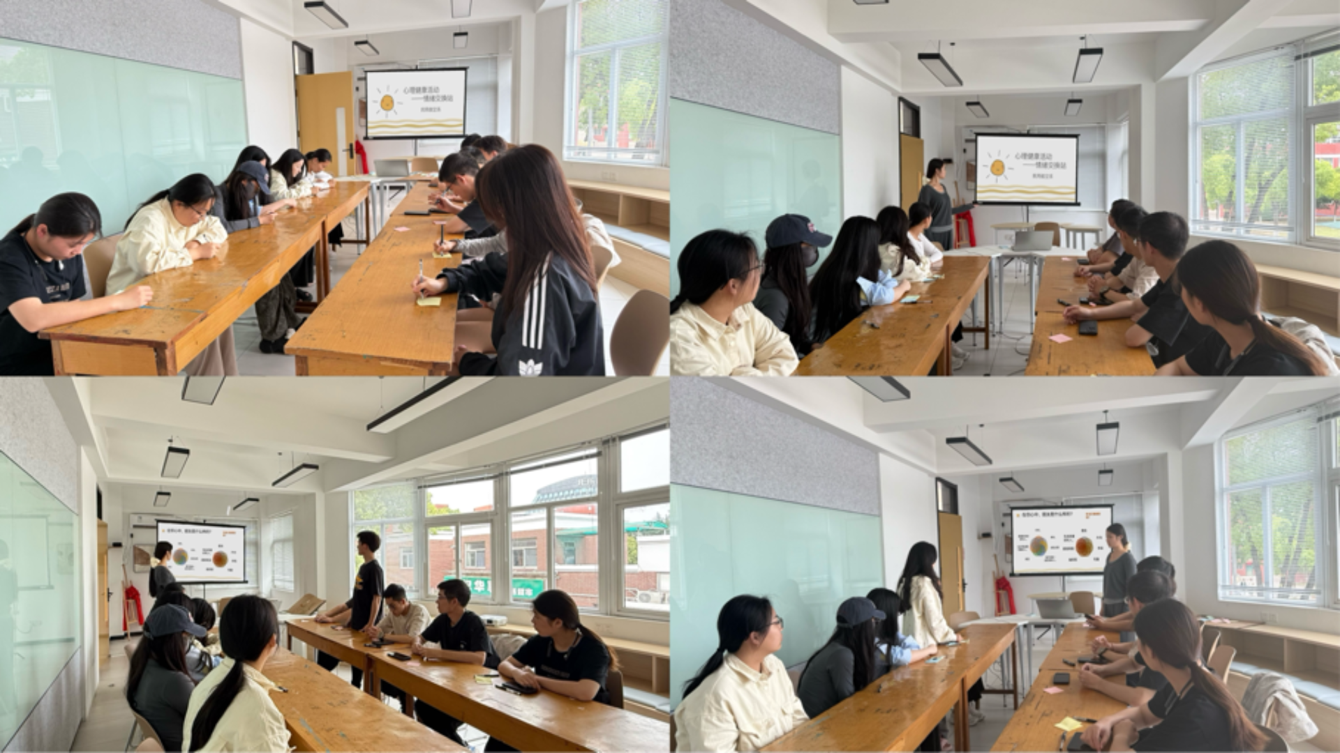 此次活动以“树洞分享 + 互助共鸣”为核心,精心设置了多个特色环节。校园“匿名情绪墙”成为同学们倾诉的秘密天地,大家纷纷用便签写下学业压力、人际困惑等烦恼,或是暖心话语,自由取阅交换,形成独特的“情绪漂流”,在匿名分享中感受共鸣与慰藉。“情绪故事盲盒”线上接龙也开展得如火如荼,同学们通过文字、手绘表情包传递着彼此的共情,打破隔阂,在交流中获得理解与支持。此外,活动现场还打造了5分钟“情绪充电站”,通过播放轻缓白噪音或励志短视频,为同学们提供了快速舒缓情绪、补充能量的空间。