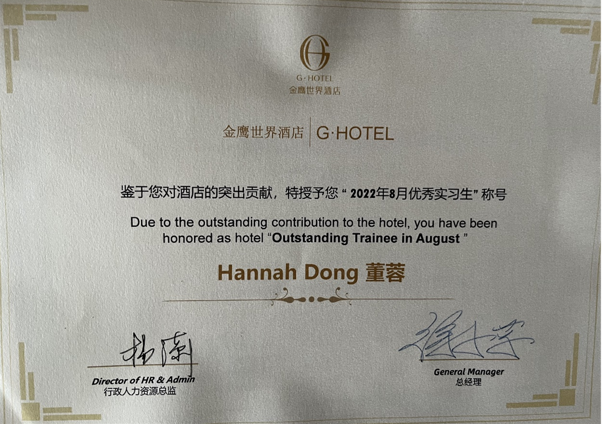G酒店评为优秀实习生。
