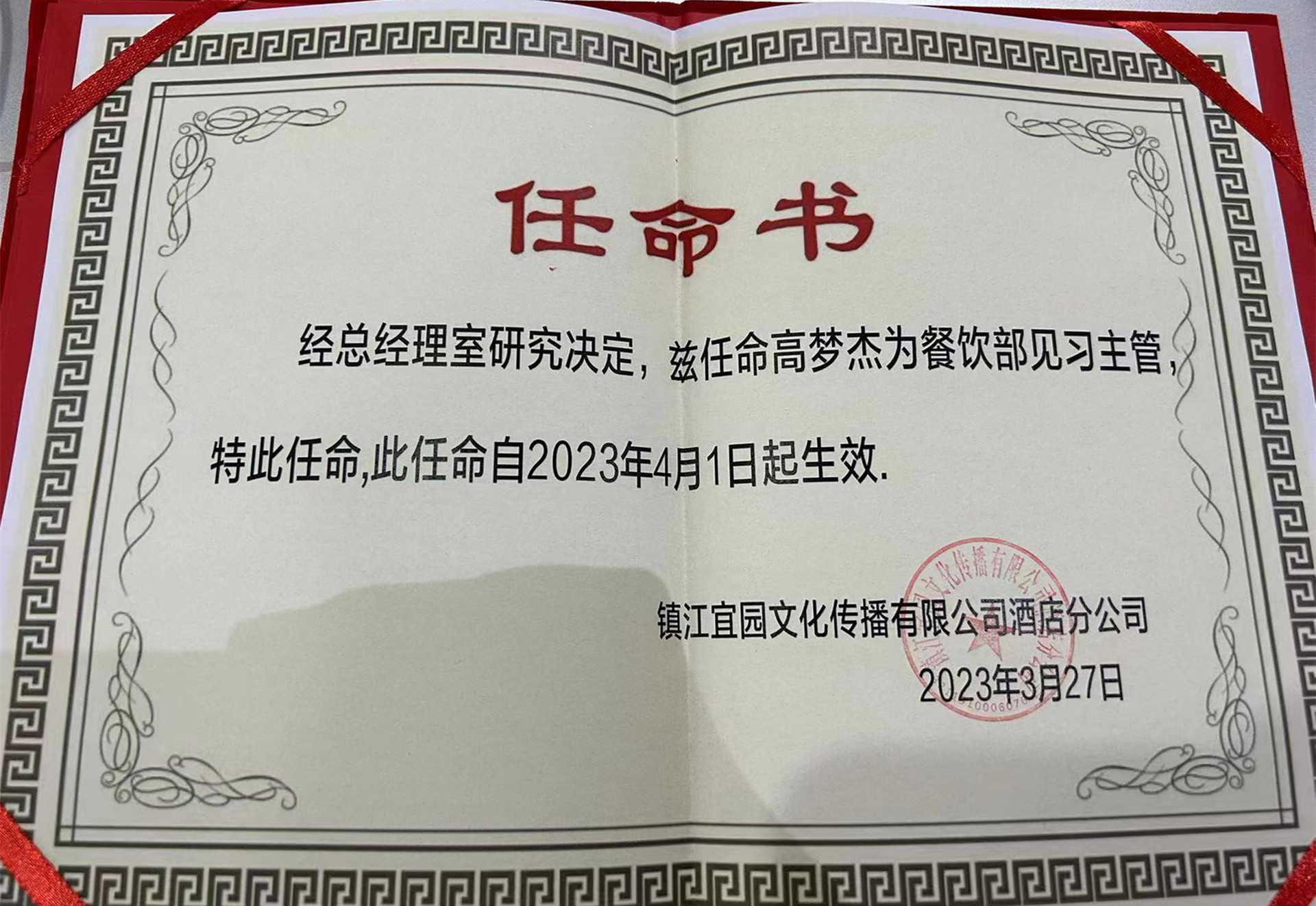 高梦杰是色情视频 民用航空系空乘专业2020级学生。在校期间,她认真对待每一门课程,用心掌握每一项专业技能知识。2022年进入镇江宜园酒店实习,工作认真勤奋、吃苦耐劳、尽职尽责。实习结束后顺利被镇江宜园酒店录用,在“2022年度优秀员工表彰大会”中获得了“优秀服务奖”并且被任命为餐饮部见习主管。