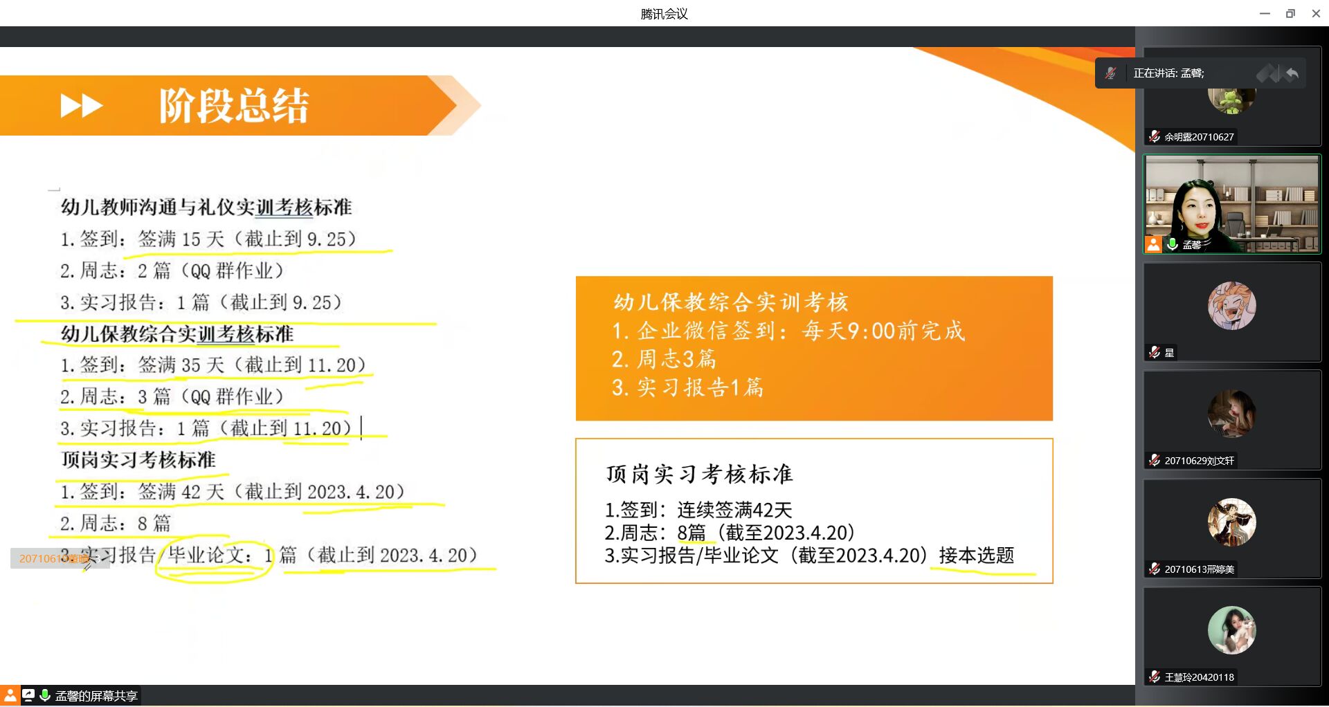 会上,孟馨在了解岗位实习过程和实习效果的基础上,对《幼儿教师沟通与礼仪实训》《幼儿保教综合实训》等课程进行了总结。孟馨表彰了在岗位实习中表现优秀的同学,仔细询问了学生在岗位实习中的收获与困难,引导学生正确认识岗位实习意义,并对学生实习以来遇到的问题进行指导答疑,及时进行帮扶。在校企合作单位“U尼可童学园”实习的王梓骁表示,“感谢孟老师每周召开岗位实习线上会议,帮助我们明确阶段目标,及时指出实习中存在的问题。让我们在岗位实习中感受到学校的关心,很温暖,有力量。”