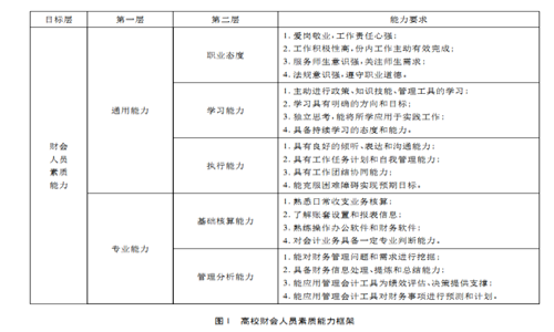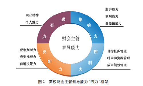 高校财会人员素质能力框架应包含通用能力和专业能力两个部分,通用能力是财会人员应具备基本职业素质,专业能力是财会人员胜任财会工作的具体任职要求。高校财务部门的财会主管及负责人在管理会计下被赋予了更多地管理运筹职责和领导能力要求,包括感召力 影响力、决断力和控制力。