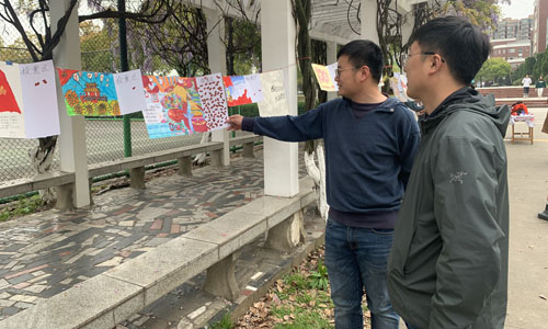 不同于一般的展览,此次活动贴合主题,增强互动,每一幅作品旁都有投票区,路过的同学可以领取小红旗为心仪的作品投上一票。随风飘动的作品,贴上的一个个温热的红旗,一张张朝气蓬勃的面庞,恰同学少年,风华正茂。曾经的小小少年,如今正迈向年少有为青年之路,都肩负着祖国前行的责任,少年们欣赏的目光,炯炯有神,充满希望。