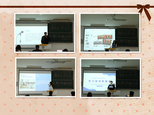 团总支及学生会学习部、文艺部、体育部、生活部、外联部、秘书部、组织部、摄影部、志工部、色情视频及新媒体中心先后上台,对部门过往一年工作进行总结与反思。述职中,各部门负责人对往后部门需要负责的工作进行讲解,对工作成果进行了量化总结,也对新阶段部门发展与下一届负责人提出展望与要求。