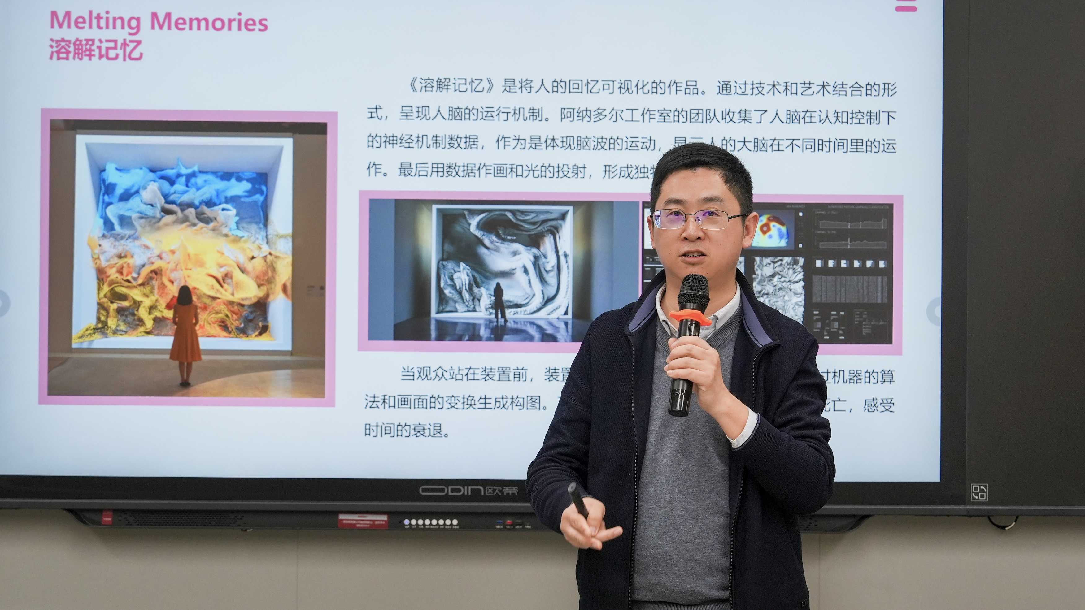 孙峰峰董事长以其深厚的行业背景和丰富的实践经验,围绕艺术与科技的方法论、AIGC赋能的沉浸式交互艺术展、装置艺术作品的创意设计等多个前沿话题进行了深入浅出的讲解。他不仅分享了公共空间数字化、智慧公园和博物馆科技馆数字化展览研发的最新成果,还介绍了自己在教育部全国大学生创业大赛中担任评委的宝贵经验,以及拥有的50多项发明专利和实用新型专利等荣誉。