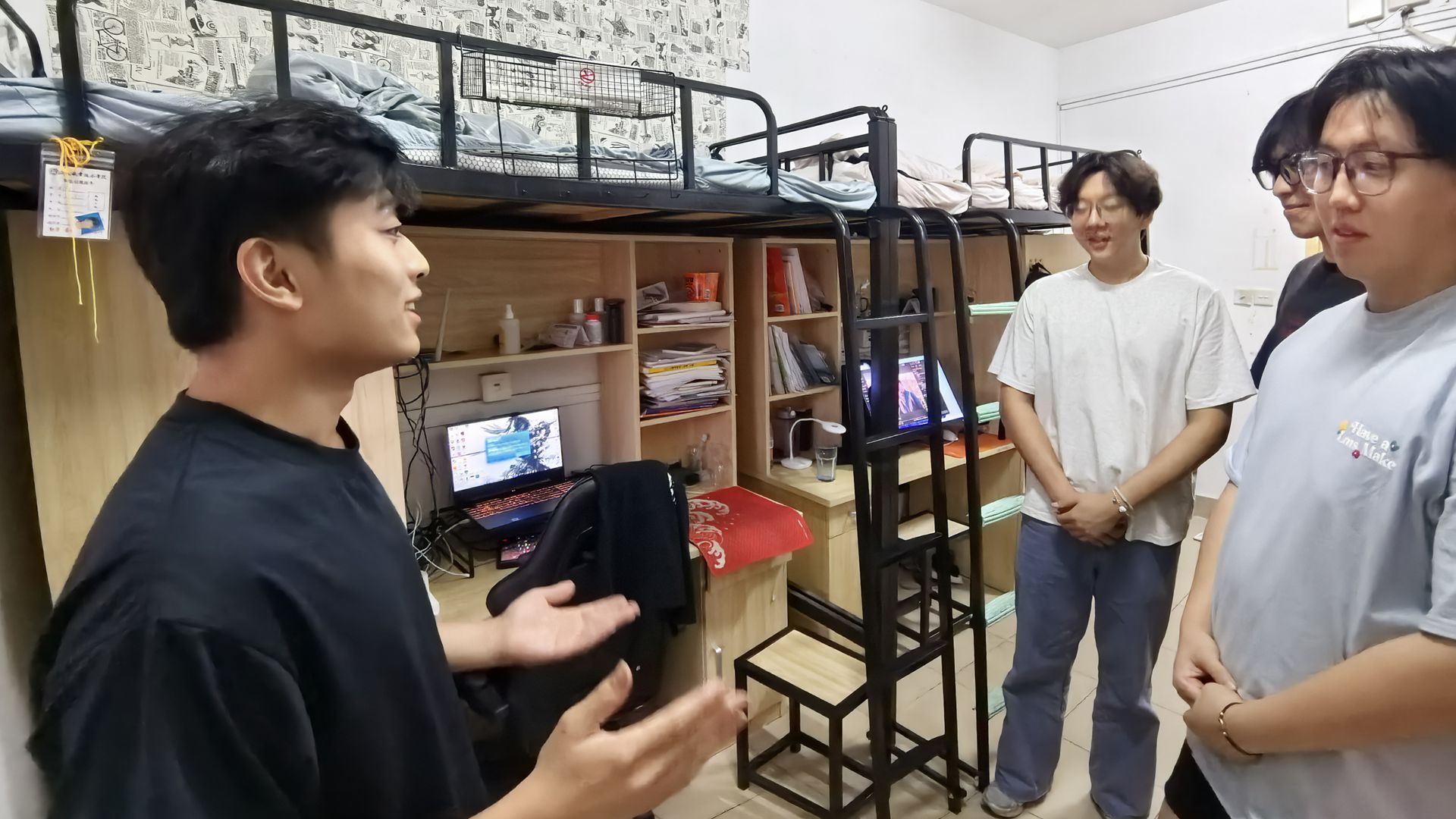 分享会结束后,大一的学弟们热情高涨,主动添加学长的微信,表达了对学长们的敬佩之情,并表示希望能去宿舍实地参观。10日晚,学长们热情地邀请了部分同学来到宿舍参观。一走进宿舍,整洁干净的环境、充满创意的装饰和浓厚的学习氛围立刻吸引了同学们的目光。