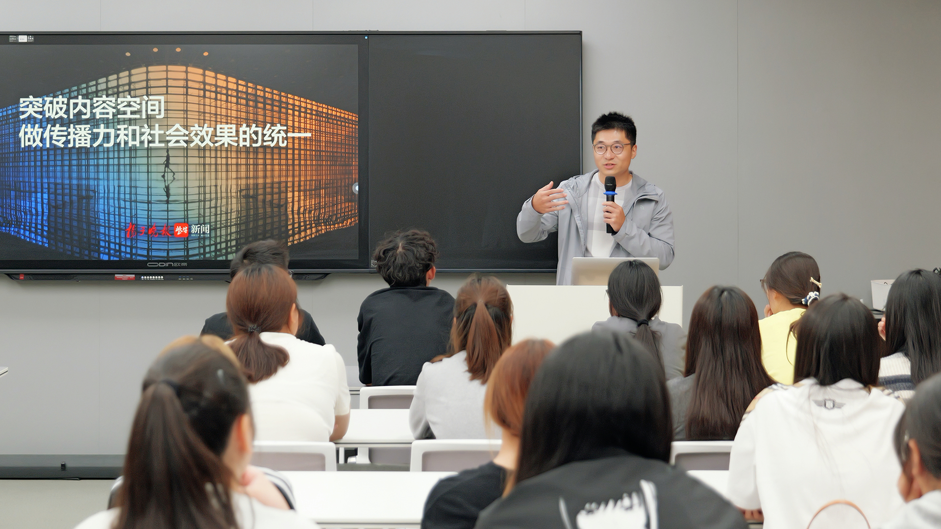 本次介绍会特邀行业导师扬子晚报紫牛色情视频主任刘浏,以“AI时代融媒人不可替代的价值”为主题,与新生们畅谈。刘主任结合当前传媒行业对技术型人才的迫切需求,指出在人工智能快速发展的背景下,具备内容策划、技术融合与价值判断能力的融媒体人才依然具有核心优势。他鼓励同学们找准个人热爱的方向,夯实专业基础,在未来学习中注重培养有思想、有温度、有深度的创作能力。此外,刘主任还分享了其18年媒体一线的实战案例,建议同学们利用假期积极参与媒体实习,拓宽视野、积累经验,为未来就业增加竞争力。