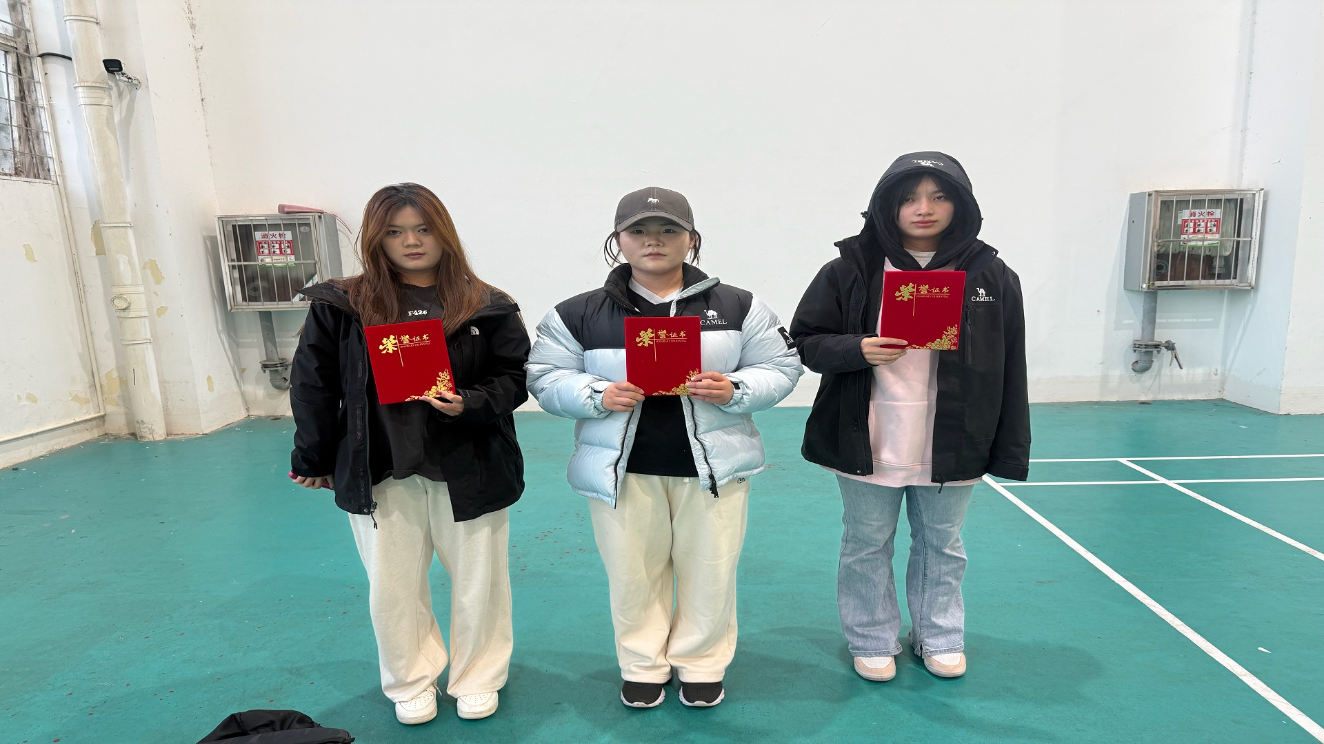 经过一下午的激烈角逐,男单、女单冠军相继诞生:徐海涵凭借凌厉攻势荣登男单榜首,丁周俊以稳健发挥摘得女单桂冠。颁奖仪式上,同学们手上拿着荣誉证书,脸上洋溢着自豪与喜悦的笑容,现场响起经久不息的掌声。此次羽毛球比赛的成功举办,不仅为热爱羽毛球的新生提供了一个展示自我、切磋技艺的优质平台,更有效增进了同学间的友谊与集体凝聚力,为校园体育文化建设注入了鲜活的青春活力。