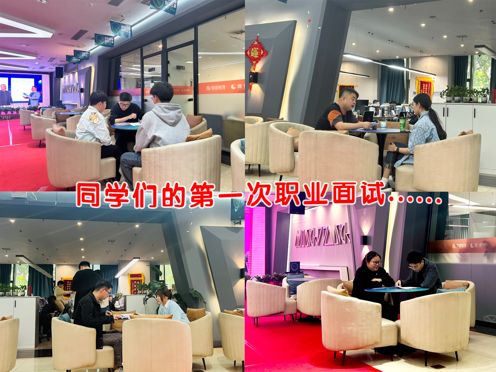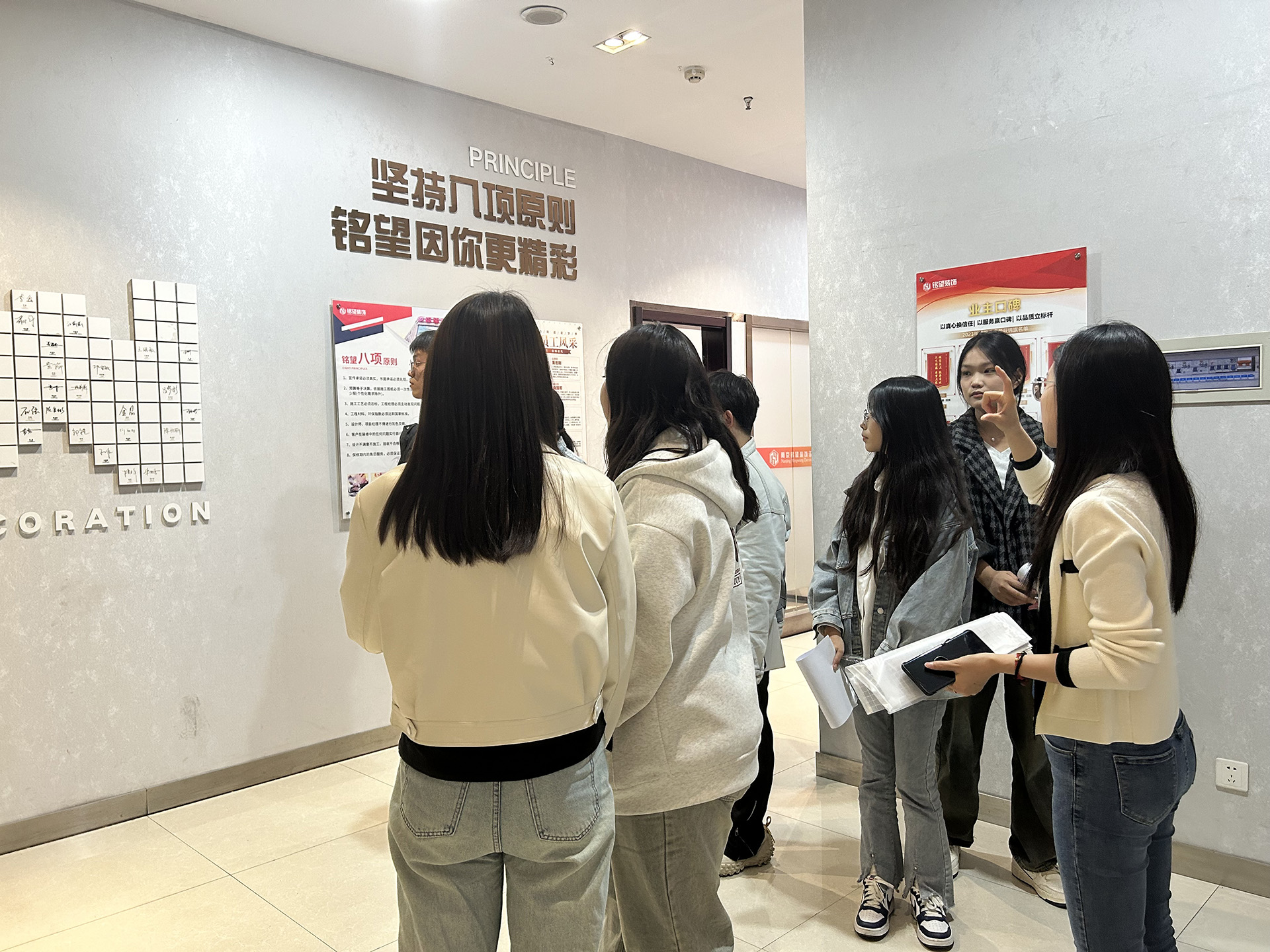 招聘活动伊始,铭望装饰招聘工作负责人人事主管吕主任带领10名学生和专业老师参观了公司的设计样板间、材料展示区和工作区,让同学们首先了解公司的基本情况并熟悉环境。在面试环节,准备充分的同学们面对设计总监的询问,认真地回答每一个问题,虽然是第一次参加招聘,但自如的优异表现展示出了平时专业学习扎实的基本功。此次应聘对他们来说是一个非常好的锻炼机会,无论成功与否,都获得了宝贵的职场经验。