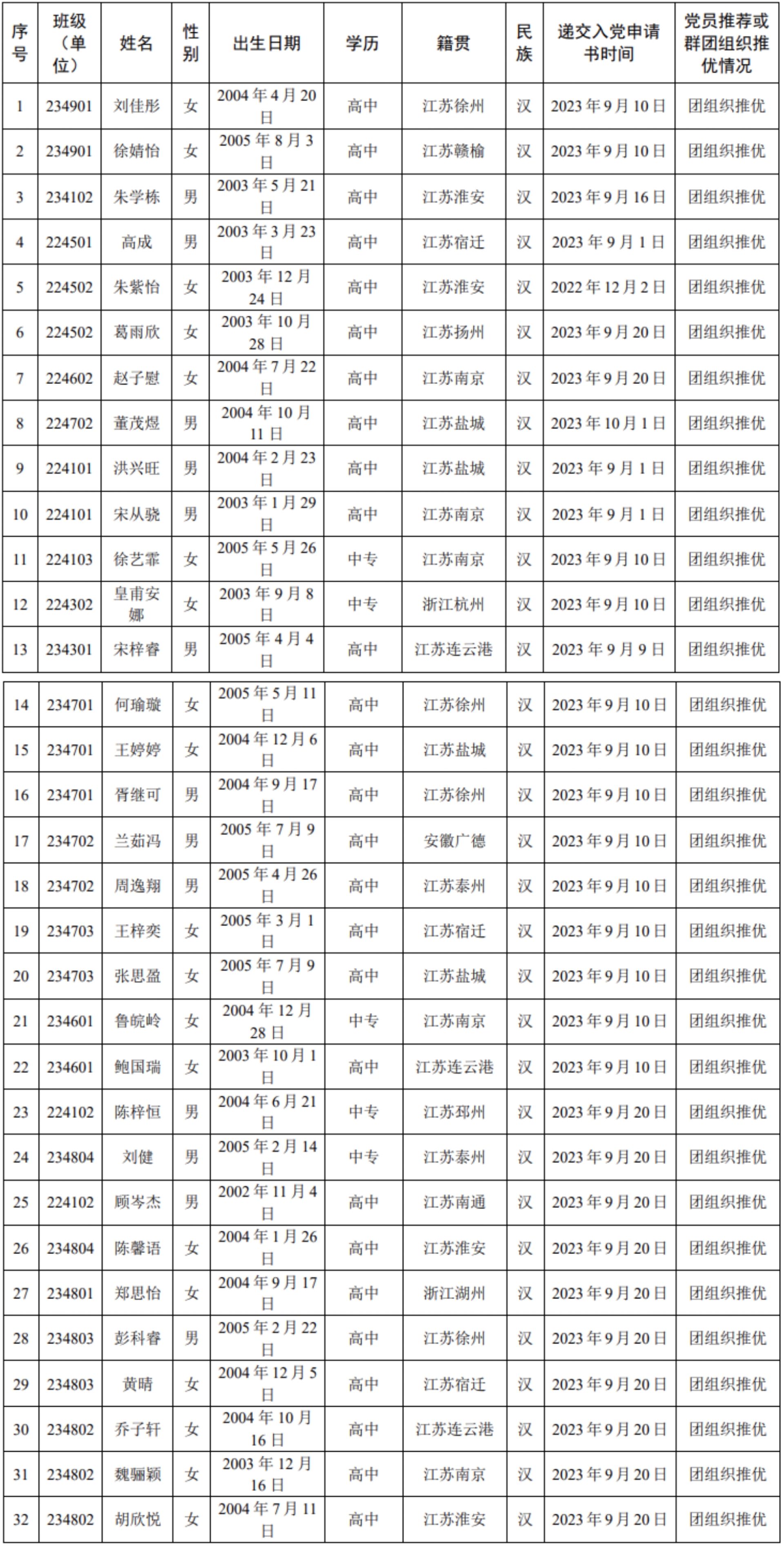 为发扬民主,广泛听取党内外群众意见,接受广大党员群众监督,现将刘佳彤、徐婧仪等32位同志的情况予以公示,公示期限为5天(2024 年3月25日-29日)。如有异议,可在公示期内向本支部反映。监督电话:025-52111894