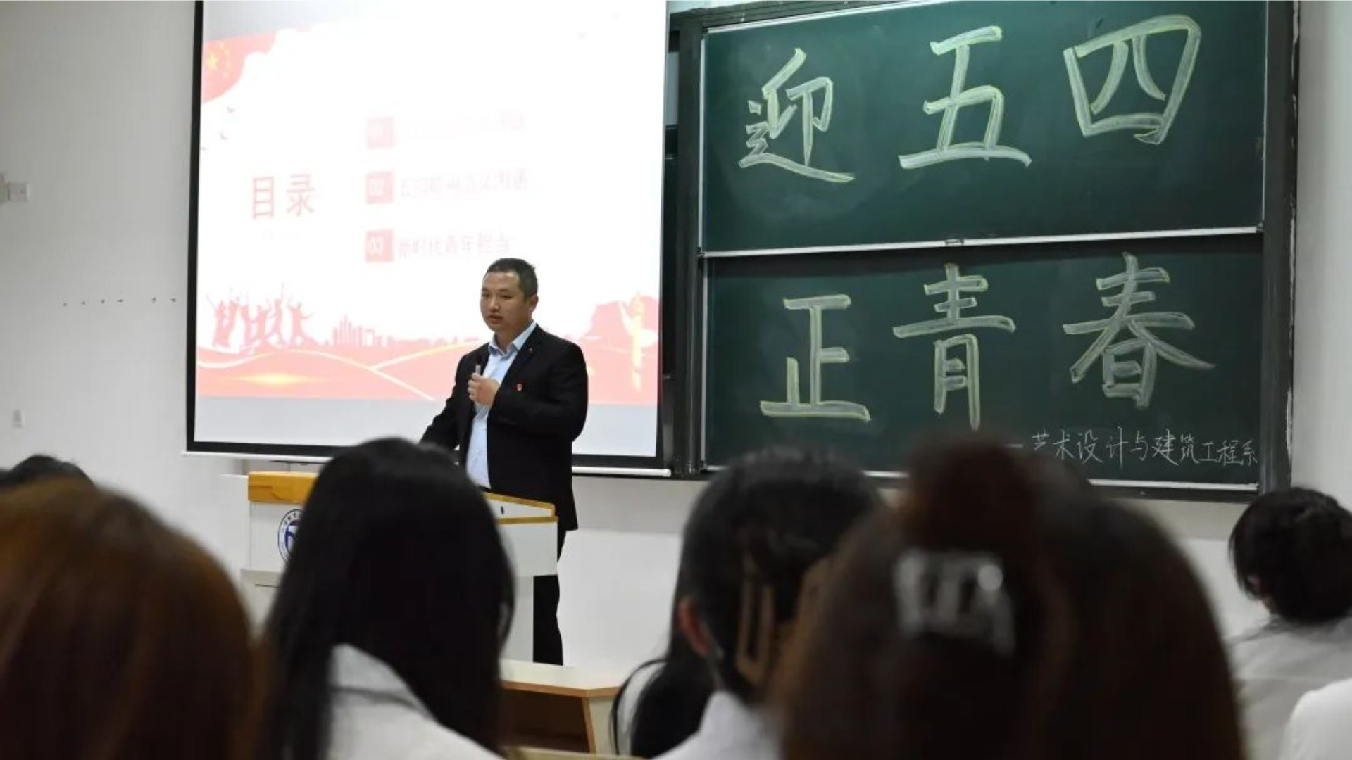为传承五四精神、凝聚青春力量,引导广大团员青年坚定理想信念。艺术设计与建筑工程系于4月13日晚18点30分在1304教室开展“迎五四,正青春”信仰公开课。此次公开课是由系党支部书记陈宏波邀请了南京传媒学院动画与数字艺术学院的团总支书记孙晨来和艺建系广大团员青年们一起座谈交流,共话青春。