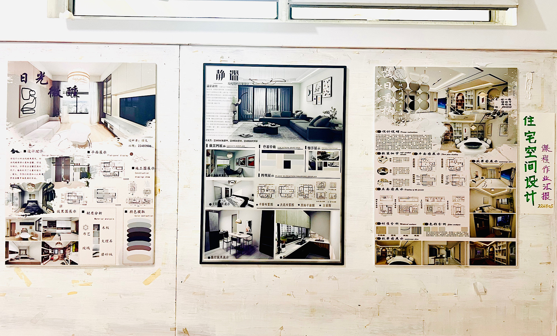 为深入学习贯彻习近平总书记关于职业教育的重要指示,认真落实全国职业教育大会精神,坚持产教融合,将“工匠精神”“精益思想”“课程思政”等元素融入课程教学,也为进一步加强同学们的学习氛围,培养学生创新思维和实践能力。2024年6月5日22级建筑室内设计专业5班《住宅空间设计》课程作业在8号楼三楼走廊展出。