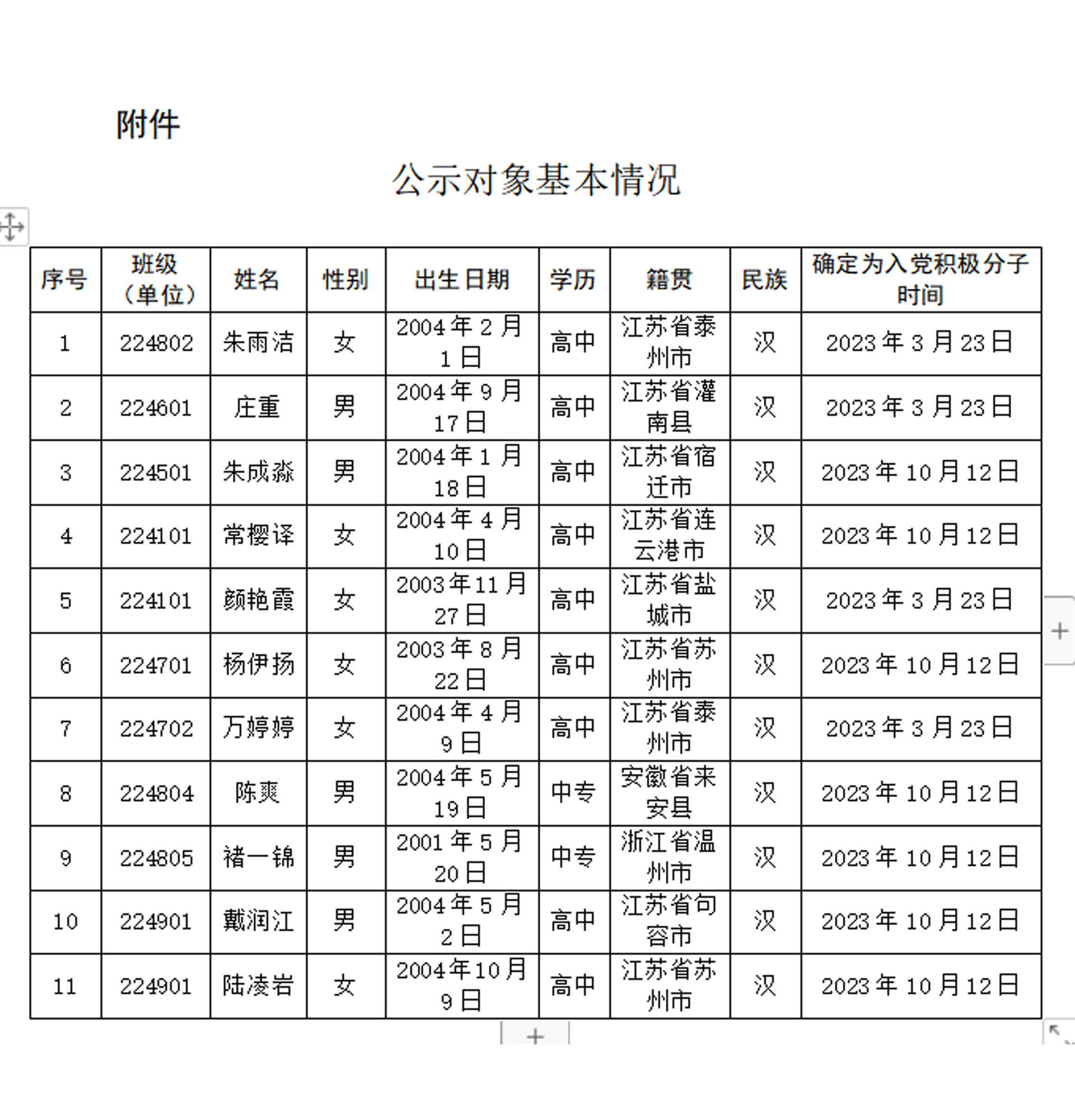 经党支部培养教育和考察,在听取党小组、培养联系人、党员和群众意见的基础上,经支委会2024年10月16日讨论,拟确定朱雨洁、庄重等11位同志为发展对象。根据发展党员工作有关要求,现将其有关情况予以公示(见附件)。