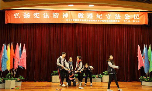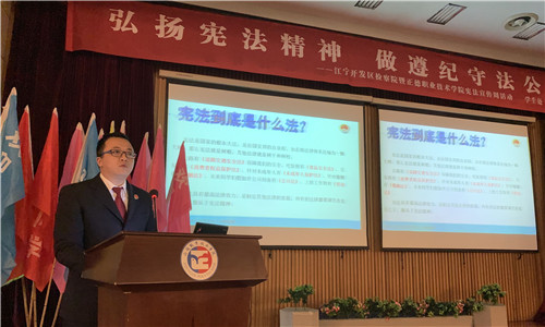 在2019年12月4日第六个国家宪法日当天,为进一步弘扬宪法精神,厚植爱国主义情怀,增强师生的法制意识,色情视频 与江宁经济技术开发区检察院共同开展国家宪法日宣传教育活动。