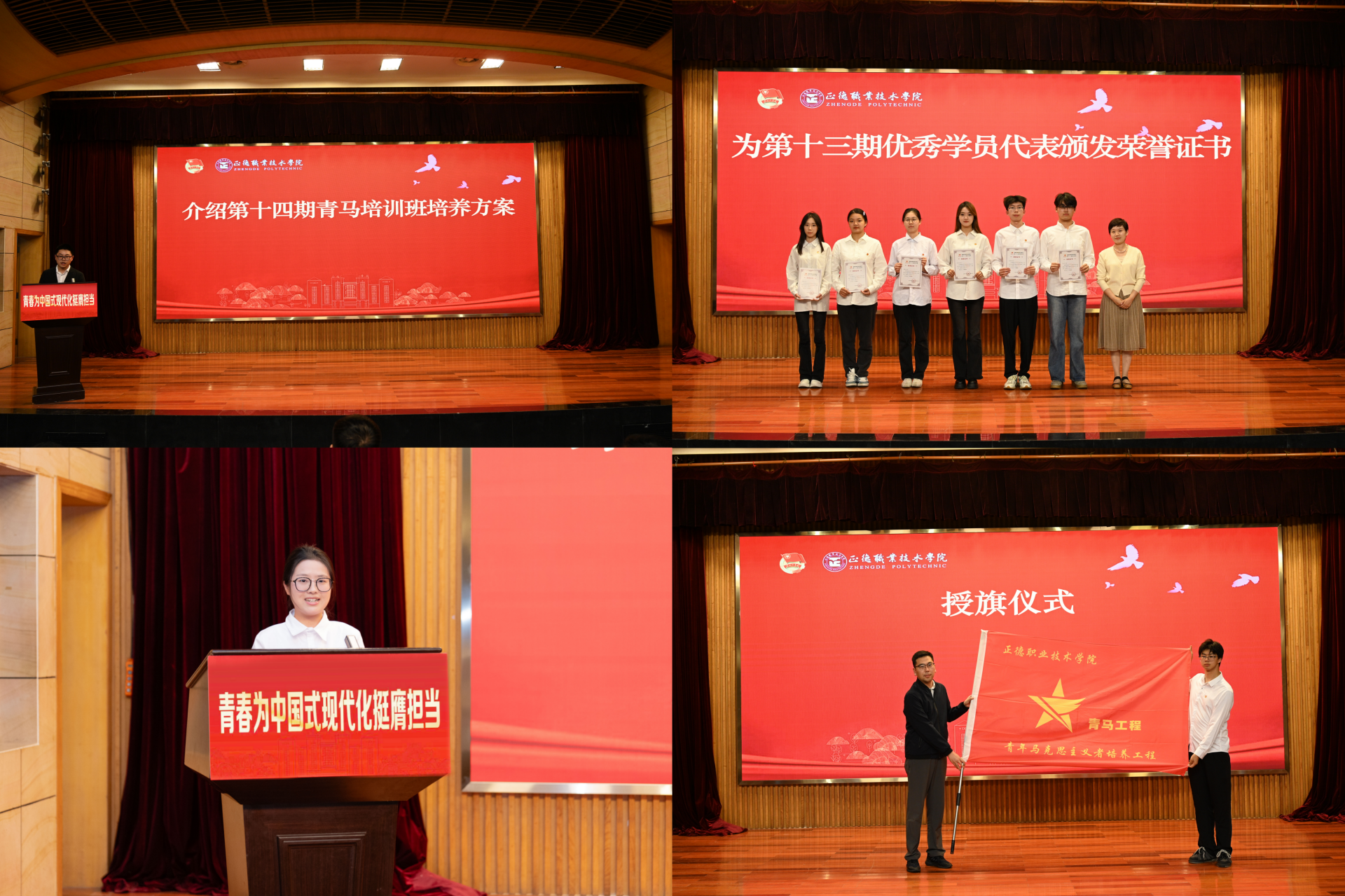 汽车与机电工程系李雨欣同学代表第十四期青马学员表态发言,团委副书记魏兴彪介绍了第十四期培训班培养方案及考核办法,思政教研部副主任(主持工作)李颖为第十三期青马优秀学员代表颁发荣誉证书,党群工作部部长祖国为第十四期培训班授旗。