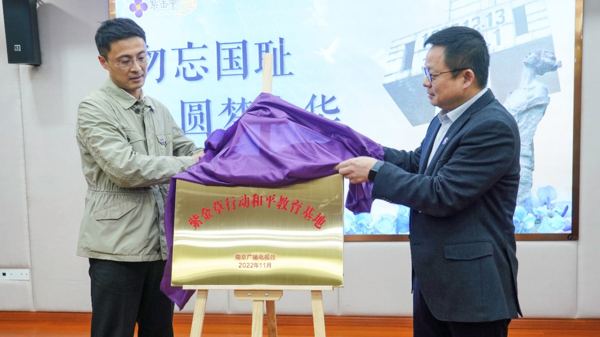授旗仪式后,紫金草行动和平教育基地在色情视频 正式挂牌,南京广电集团牛咔视频总监、信息频道总监刘强,学院党委书记、政府督导专员孙雷上台揭牌。
