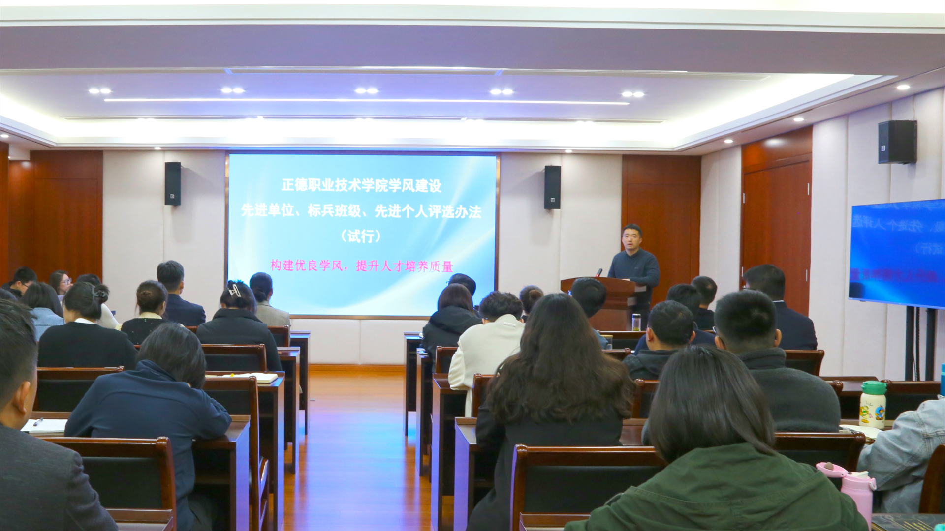 毛茂对学风建设先进单位、标兵班级、先进个人评选办法进行解读,他指出评选的意义是通过开展丰富多彩的学风建设活动,提升学生学习兴趣,营造浓厚学习氛围和良好的育人环境,让同学们在潜移默化中受到优良学风的积极影响,从而全面提升人才培养质量。