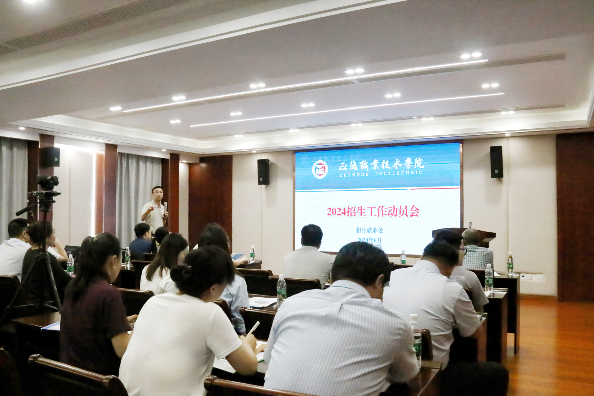 会上,教务处王燕处长对学院学历提升工作体系尤其是专转本自主辅导班的开设进行介绍、学生处祝佳俊处长介绍了学院学生管理的十大特色,各系主任分别对本系专业设置以及各专业办学亮点进行简要介绍。王墀给所有招生人员做招生工作培训,介绍2024年江苏省高考工作方案、学院人才培养工作特色以及招生宣传工作注意事项。
