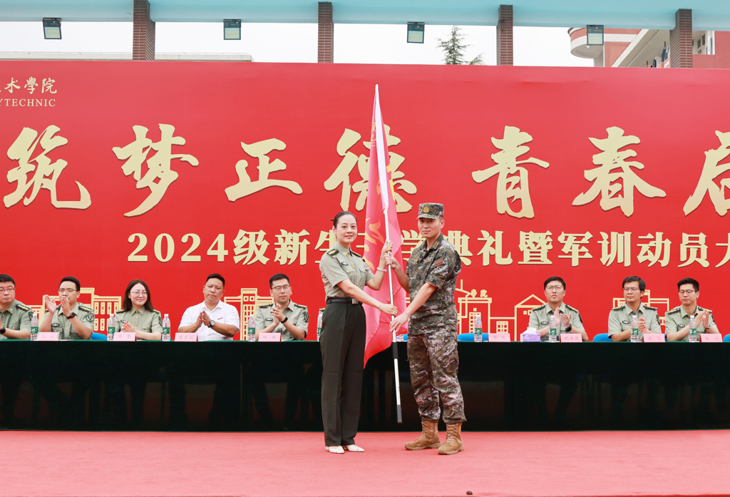 会上,梁薇向军训团授旗,张茂代表军训团接过旗帜。