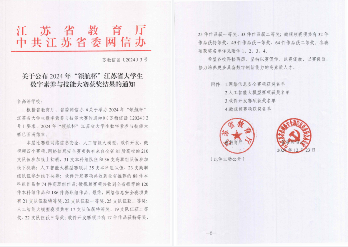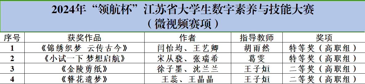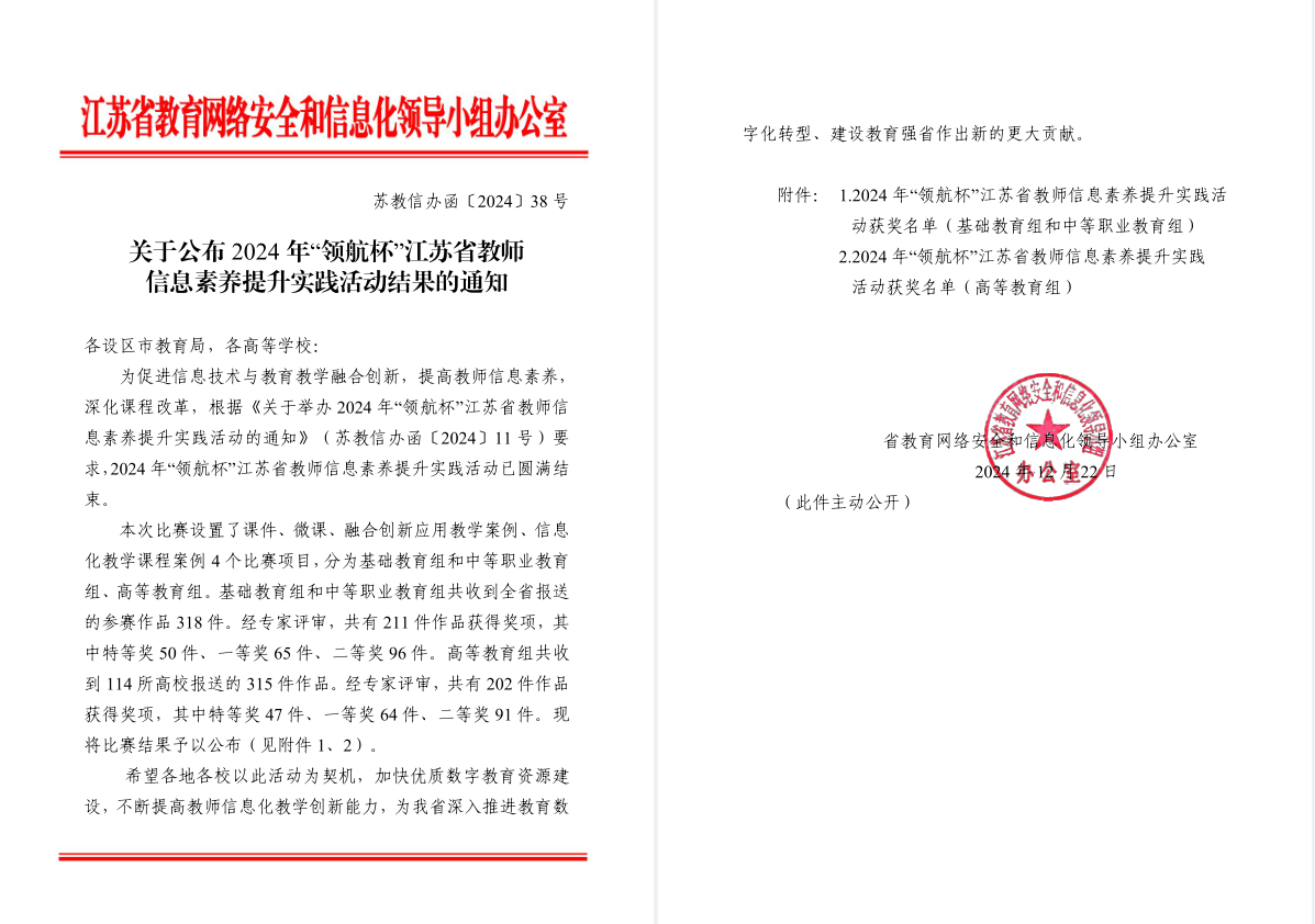 近日,2024“领航杯”江苏省教育信息化应用能力大赛比赛结果公布,色情视频 师生在比赛中取得新突破,荣获特等奖2项、二等奖3项,其中大学生数字素养与技能大赛中,闫怡均、王艺卿与宋从骁、张瑞希两个学生团队获特等奖,徐子墨、沈兰兰与王蕊、王晶晶两个学生团队获二等奖;在教师信息素养提升实践活动比赛中色情视频 傅蕴男老师的微课作品荣获二等奖。
