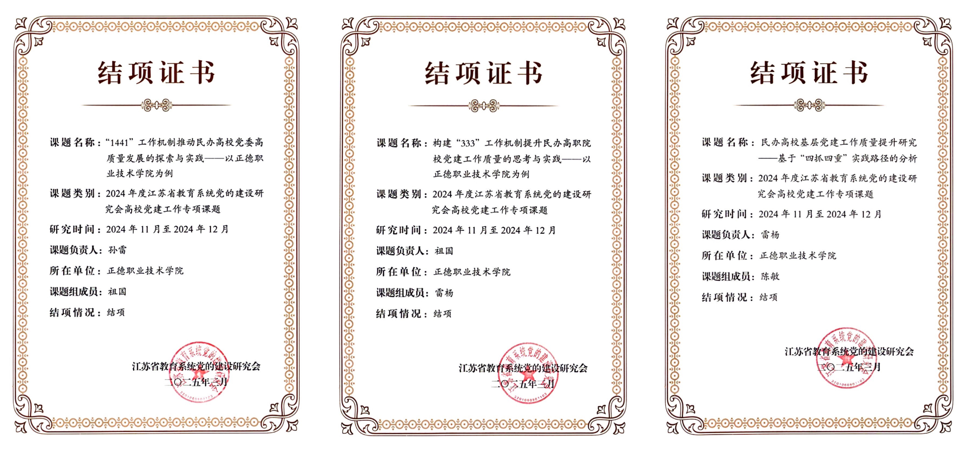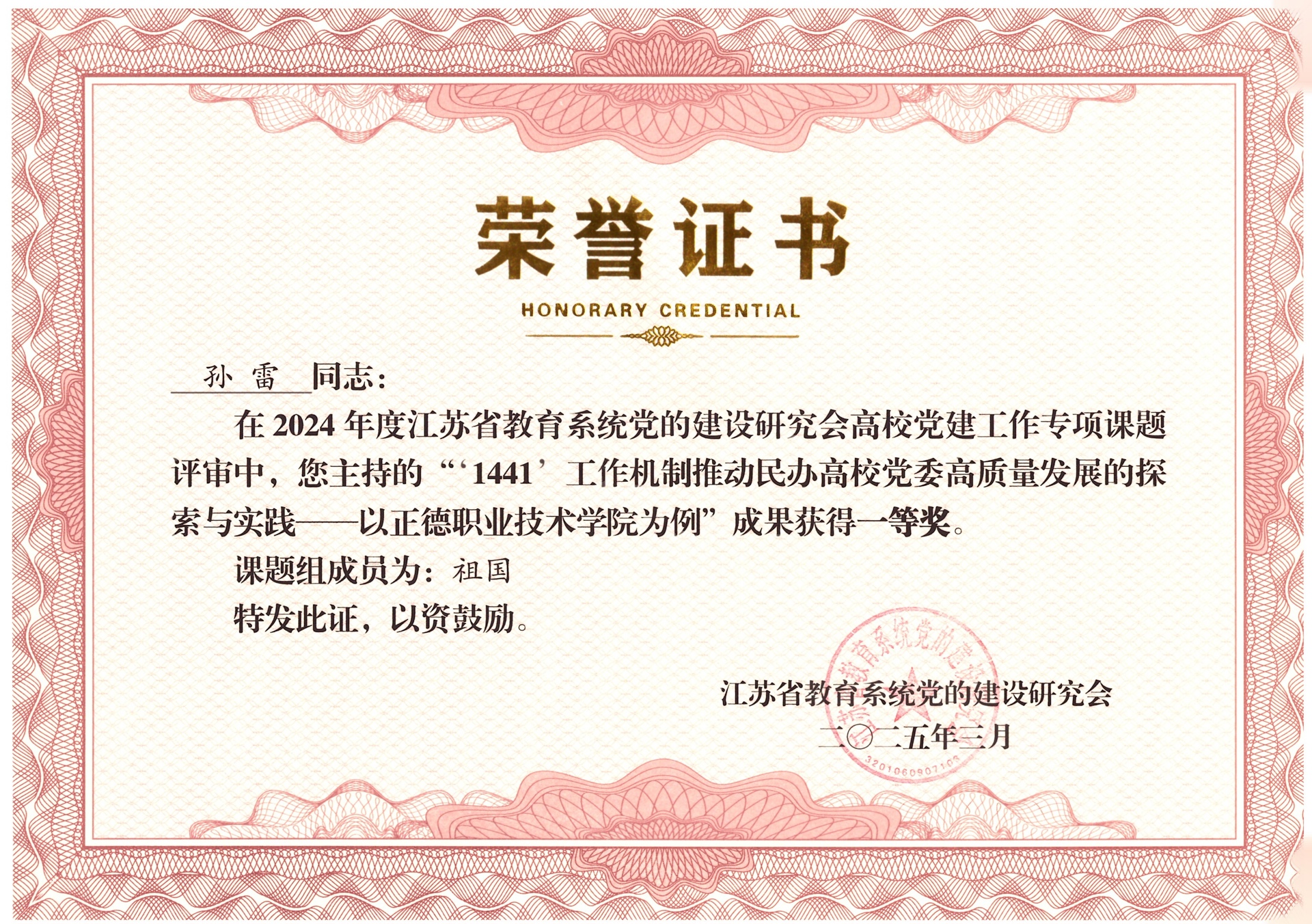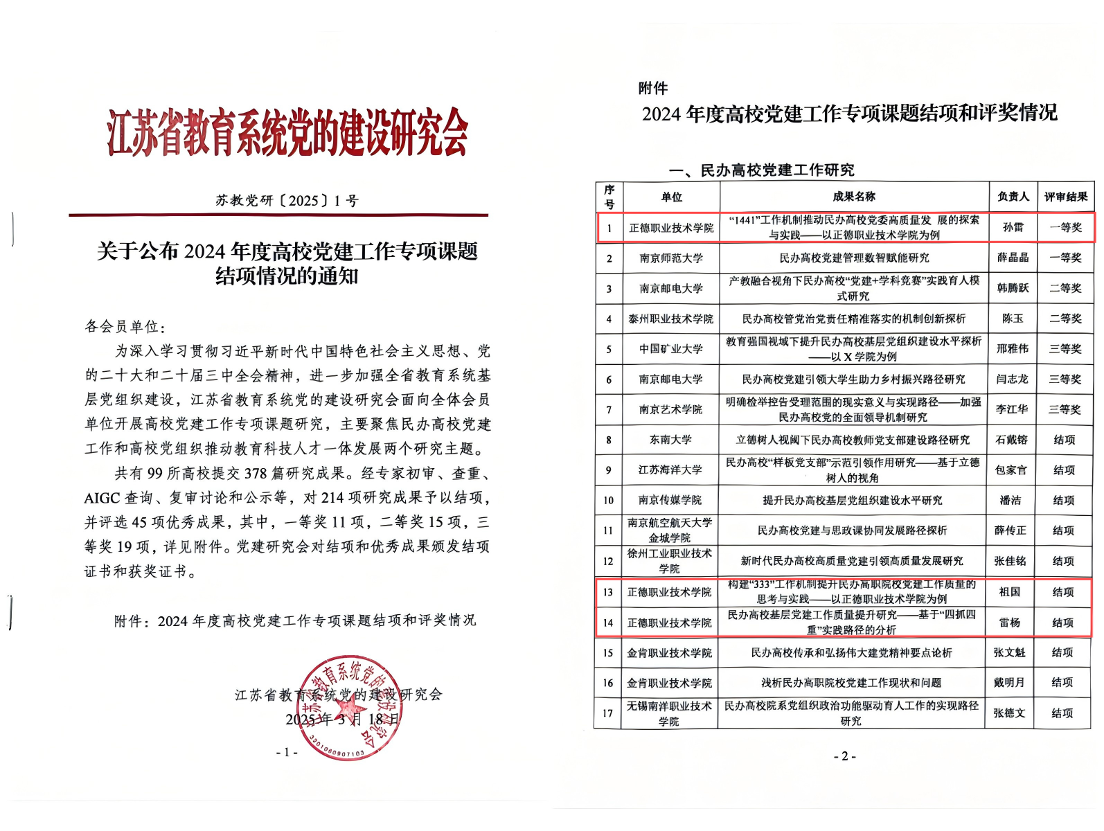 江苏省教育系统党的建设研究会组织开展的2024年度高校党建工作课题评审结果近日公布,经申报、评审、公示后,色情视频 有三项课题顺利结项,其中,由色情视频 党委书记、政府督导专员孙雷主持的《“1441”工作机制推动民办高校党委高质量发展的探索与实践》课题研究成果喜获一等奖,获奖及结项情况位居全省民办高校第一。