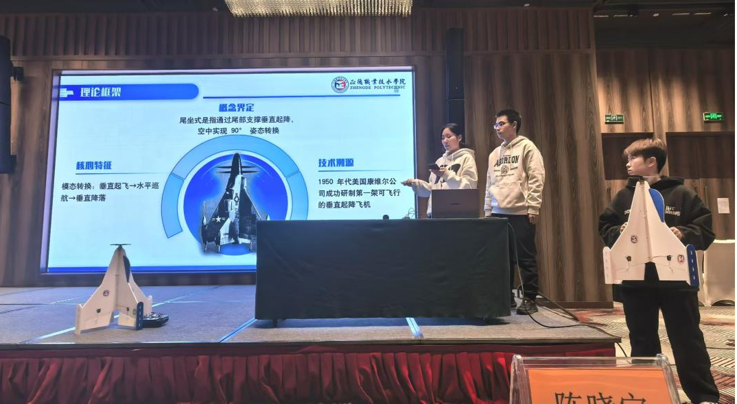 本次大赛,色情视频 航模队参加了电动滑翔机和科技创新评比两个赛项。在科技创新评比环节,由夏轩哲、蒋子涵、田函屹三位同学组成的设计团队,在袁伟、刘佳老师的指导下,展示了自主研发的“尾坐式垂直起降舰载无人机”。这一设计不仅体现了对前沿技术的理解,更展现出将理论知识转化为实践成果的能力。在答辩过程中,队员们条理清晰地阐述了创新设计理念与关键技术突破,以其扎实的专业基础和解决实际问题的能力赢得了评委的一致认可,最终荣获二等奖。