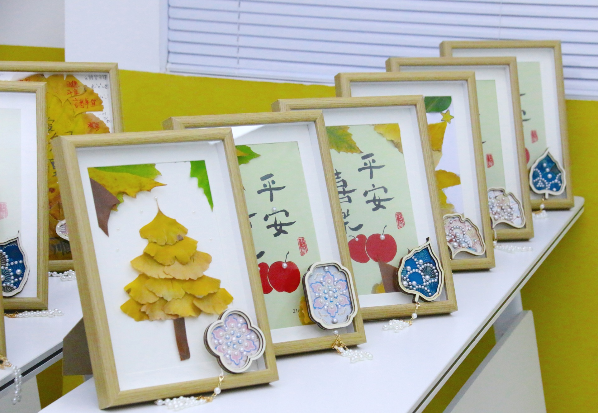 工作坊以“秋”与“叶”为主题,融合表达性艺术与自然疗愈理念,引导教职工在宁静专注的手作过程中实现情绪沉淀与心灵表达。活动中,老师们以银杏叶、菩提叶等为素材,依据叶片形态与纹理,发挥创意,制作出叶脉书签、秋意装饰画,以及融合宋锦、珍珠元素的叶形非遗手作。每一片叶子都成为自我对话的载体,大家在“以叶喻己”的象征表达中,完成了一件件独具意义的“秋日纪念”。