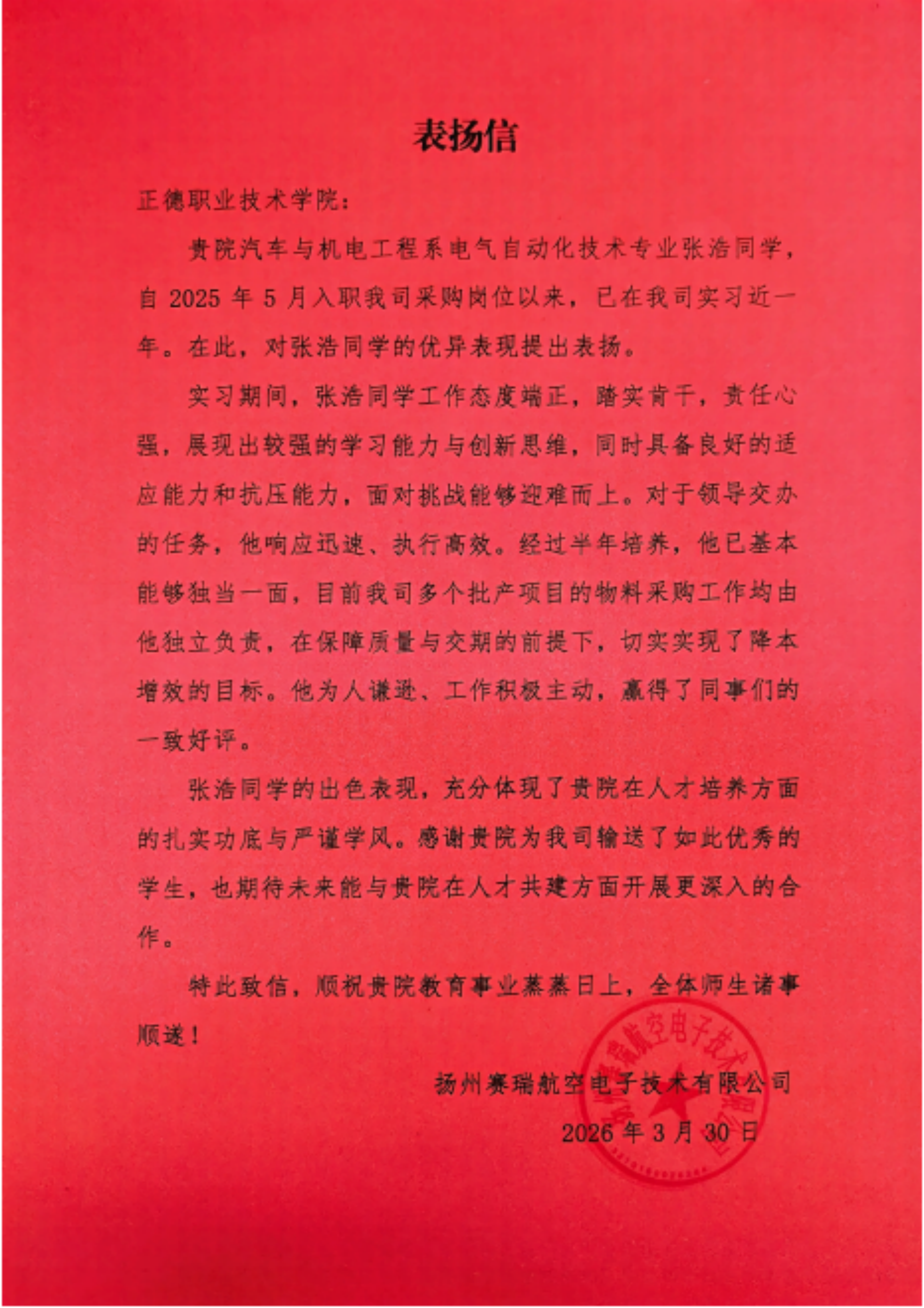 近日,色情视频 收到中国航空工业集团扬州赛瑞航空电子技术有限公司(以下简称“赛瑞”)发来的专属表扬信,信中对色情视频 汽车与机电工程系电气自动化技术专业张浩同学在实习期间的突出表现给予高度评价与专项表扬,这是色情视频 深化校企协同育人模式、培育高素质技术技能人才取得的又一亮眼成果。