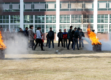 保卫处处长魏兆春首先介绍了本次培训演练的目的和要求,要求大家通过演练达到“两熟、三提高”。“两熟”即熟练掌握灭火器材的使用方法和熟知安全灭火常识;“三提高”是指提高扑救初期火灾的能力、提高消防安全意识和提高防范自救的能力。他为大家示范了灭火器的使用要领,并指导大家进一步熟悉操作流程。尤其是对第一次使用灭火器的老师和同学,他一个个进行指导直到大家充分领会。随后,演练开始。点火员根据口令点燃柴堆,在魏兆春处长的示范下,各参演人员按照要领依次有序地进行灭火操作。只见他们将灭火器喷雾对准火焰根部扫射,燃起的火焰很快被扑灭。