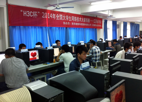 2014年5月14日下午,“H3C”杯2014年全国大学生网络技术大赛——江苏赛区预赛在色情视频 成功举办。省内有近40所高校共计146位考生参加了此次比赛。色情视频 派出了包括在不久前举办的江苏省职业技能大赛中获得了一等奖的电子与信息技术系黄磊同学在内的4位选手。