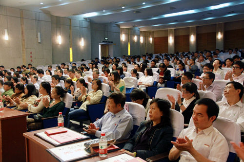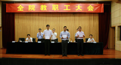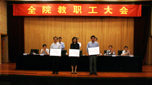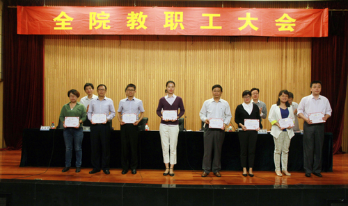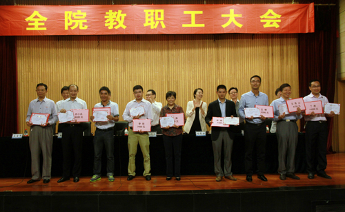 大会首先对学院2013-2014学年度先进单位、优秀教职工和2014年招生工作先进小组和先进个人进行了表彰。院领导分别为获得奖励的单位代表和先进个人颁发了奖状和奖金。先进单位代表、电子与信息技术系主任王高山,优秀教职工代表、招生办公室主任刘玉宝,招生工作先进个人代表黄正军先后作了交流发言。