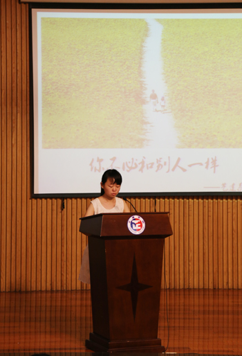 报告会上,王孟孟同学以《你不必和别人一样》为题,做了一场精彩的演讲,陈述了自己逐梦路上的成长故事,让在场的老师、同学们无不为之感动。随后,陪伴孟孟五年的好友刘晨夕讲述了她们从相识相知到相伴的美好又难忘的时光。辅导员孟馨老师向大家讲述自王孟孟入校以来,自己鼓励她克服困难,指导其发声、咬字,并鼓励其积极参加校内外各类专业比赛的故事。艺术设计与建筑工程系2014级丁洁、邵文静、袁善之和张志健同学依次作为学生代表上台作表态发言。