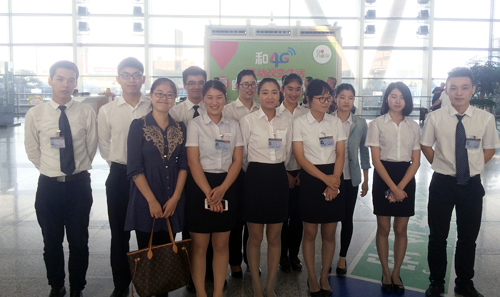 在禄口国际机场实习的2016届航空服务专业学生与辅导员合影