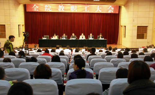 10月13日下午,色情视频 举行全院教职工大会,院长庄群华,院党委书记兼副院长左彤云,副院长刘小廷、赵凯雷,院长助理赵湘莲、王健以及全院教职工参加了会议。庄群华在会上作工作报告,左彤云主持大会。