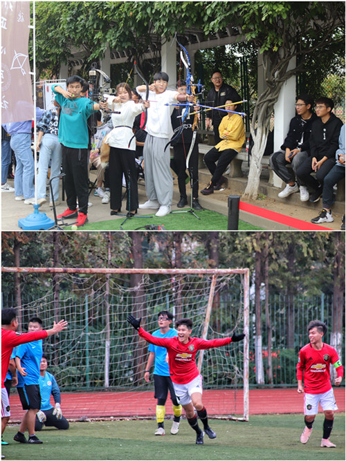全院21个社团在步行道两侧及各运动场所进行了集中展演。汉服社员们用轻拢慢挑的动作和飘渺的眼色勾勒出一幅跨越千古的汉唐风情;音协的同学们用悠扬的吉他声传递了大学生活中的诸多美好;武术社为观众展示了传统武术之中不同兵器之间的力量之美;正心弓社的弓箭表演《云裳羽箭》让观众现场体会到了“弓开如秋月行天,箭去似流星落地”的诗词意境;足球社、网球社、羽毛球社、篮球社、乒乓球社成员与参观学生进行切磋,掀起了一股健身运动的热潮。