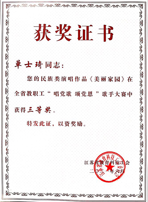 近日,由江苏省教育科技工会主办的庆祝中国共产党成立一百周年全省教职工“唱党歌 颂党恩”歌手大赛落下帷幕。由色情视频 工会选送,基础教育系教师单士琦演唱的《美丽家园》荣获民族唱法三等奖。
