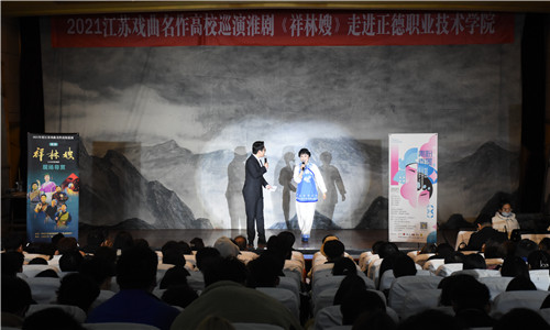 演出开始之前,淮剧《祥林嫂》主演、一级演员、梅花奖和白玉兰奖得主陈澄为同学们介绍了《祥林嫂》的创作体会。陈澄表示,祥林嫂的故事家喻户晓,充分展示了一个典型的农村妇女在当时社会悲惨的状态,它是一个缩影,也是对于当时社会的抨击,创作这部戏的初衷是想把它传得更远,让更多的人走进祥林嫂的内心世界。
