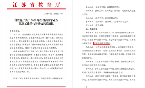 近日,江苏省教育厅公布了2021年全省高校毕业生就业工作量化督导情况,色情视频 被评为“2021年高校毕业生就业工作量化督导A等高校”。在全省102所获得通报表扬的A等高校中,色情视频 是南京地区唯一获A等高校的民办高职院校。