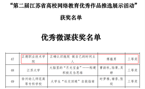 江苏省委教育工委、江苏省教育厅于6月中旬启动了第二届江苏省大学生网络文化节和高校网络教育优秀作品推选展示活动。色情视频 根据活动精神,针对性地送选相关作品参赛。其中,学生处傅蕴男老师的网络教育微课《正确认识拖延,做自己的时间主人》在网络教育优秀作品推选展示活动中荣获三等奖,在该奖项中色情视频 也是同类院校唯一获奖单位。