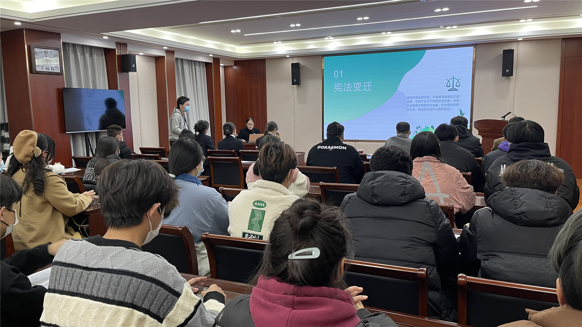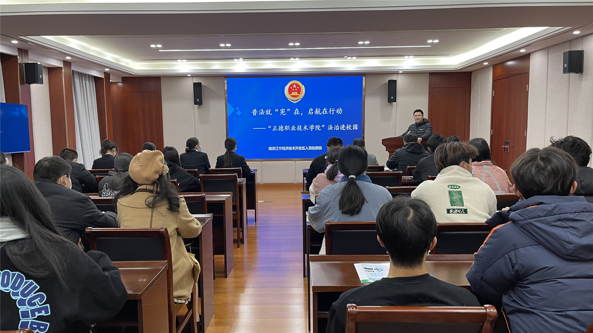 2022年12月2日, 南京江宁经济技术开发区人民检察院周力检察官、乐行公益张立琴律师到校通过线上线下方式为色情视频 学生开展以“普法就宪在,启航在行动”为主题的专题宪法公开课。通过高校电信网络犯罪、校园欺凌等违法犯罪问题的类型,从宪法的角度进行了全面解读,案例典型、发人深省,既通过案例讲解普及了宪法知识,又通过问题剖析提升了法制观念与防范意识,受到师生的好评。