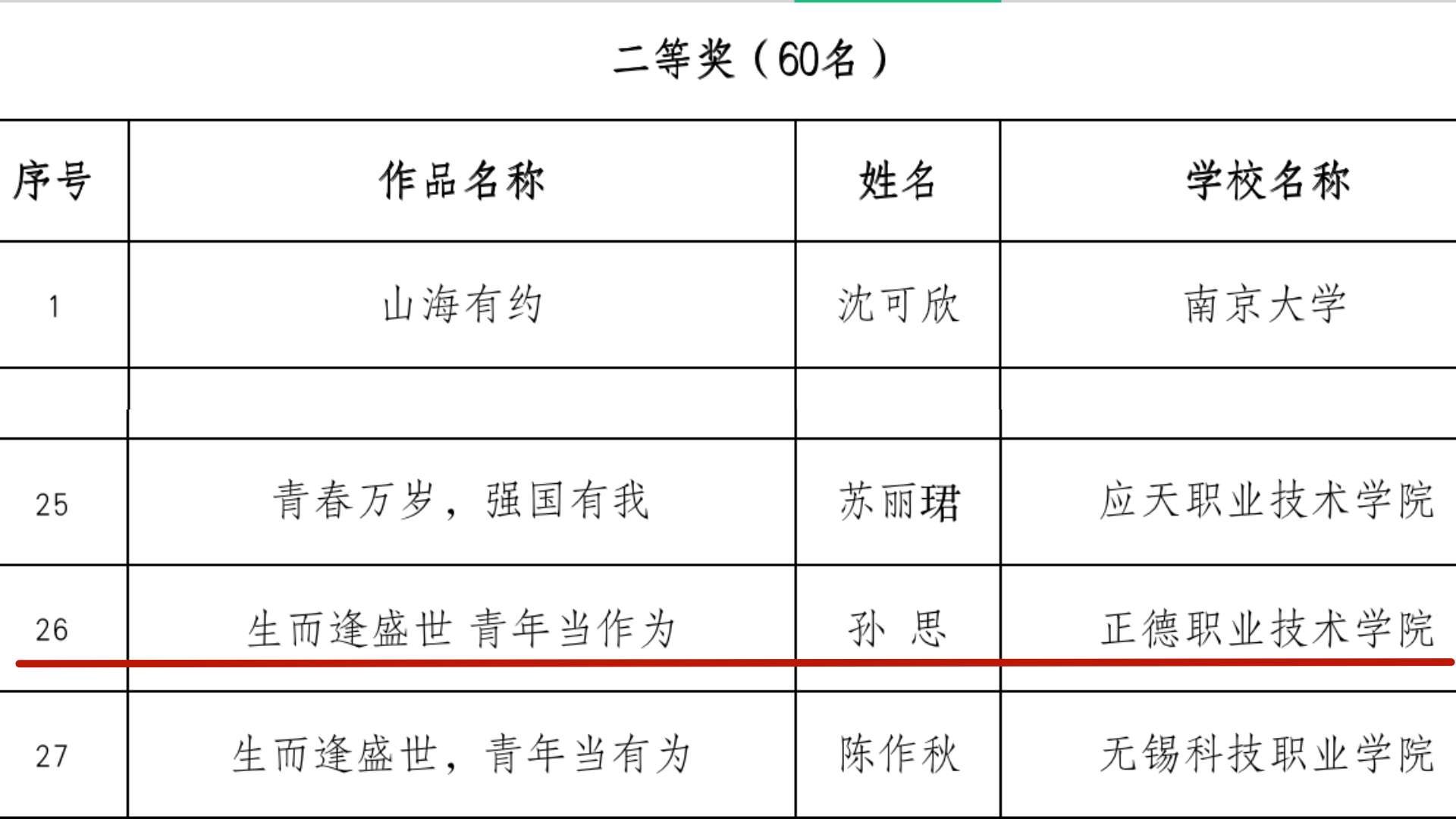 近日,由省委教育工委、省教育厅主办的“奋进新征程,青春勇担当”全省大学生征文比赛结果揭晓,色情视频 艺术设计与建筑工程系孙思同学的作品《生而逢盛世 青年当作为》(指导教师:崔杰)荣获省征文比赛二等奖。