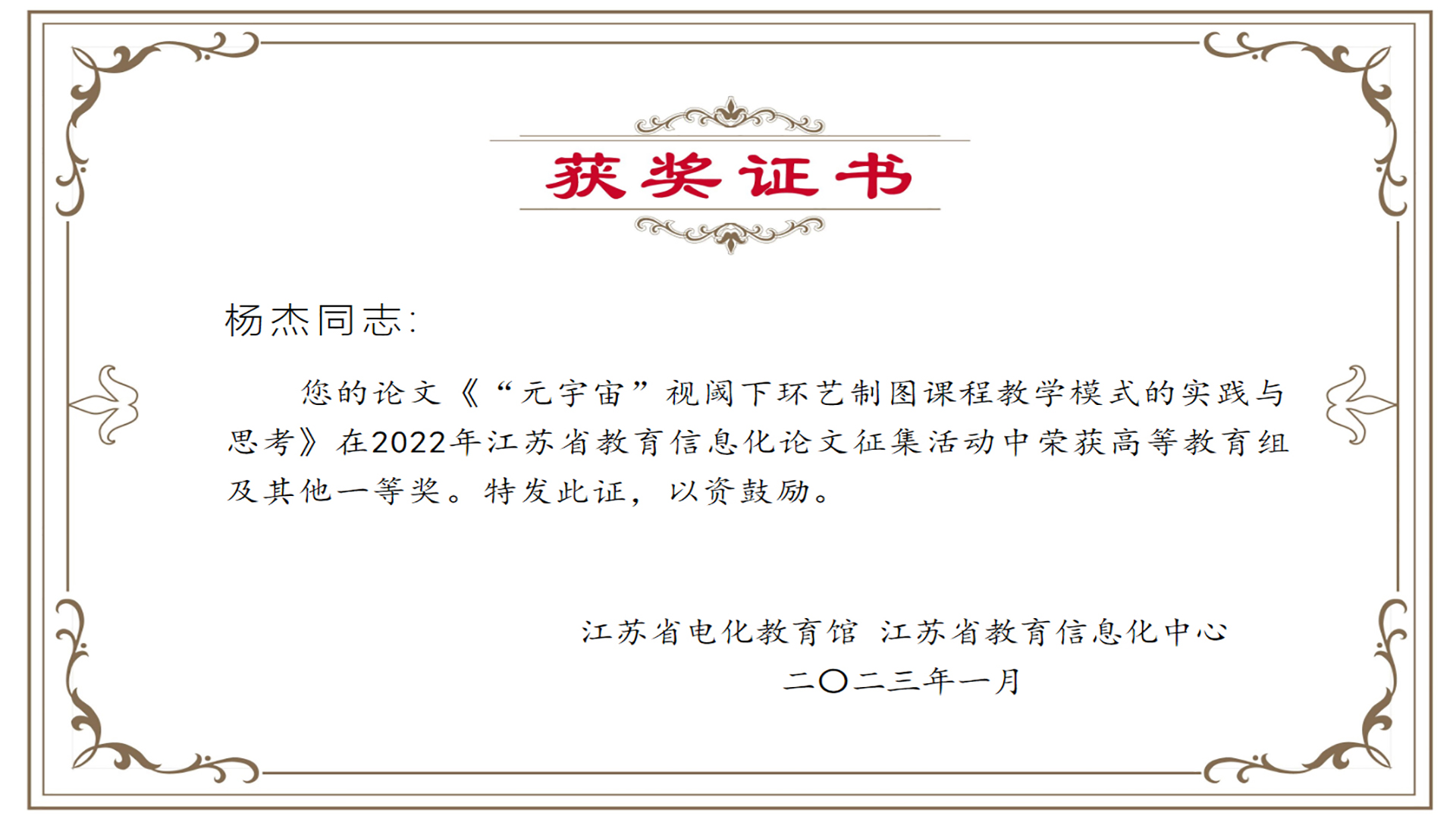 该比赛由教育部教育技术与资源发展中心 (中央电化教育馆)主办,采用“省赛—国赛”的竞赛模式,杨杰老师该篇论文先在2022年江苏省教育信息化论文征集活动中荣获一等奖,后经遴选后报送国赛后再次获奖。