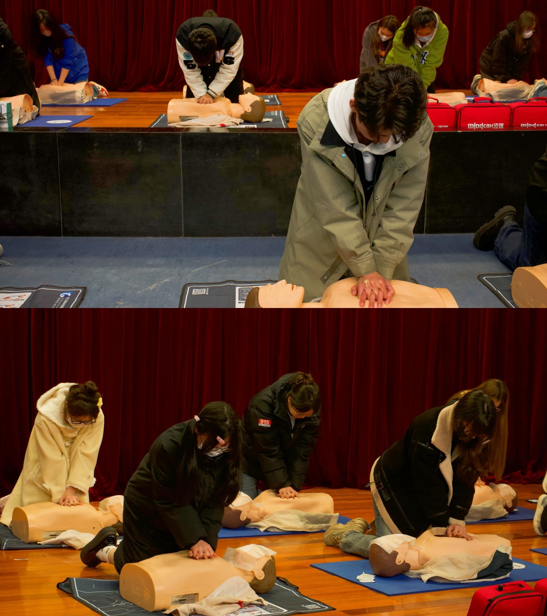 实操部分,蓝豹救援队的徐海老师重点演示了如何对伤员进行心肺复苏以及AED的正确使用方法。在演练中,同学们踊跃参与模拟情景,积极提问急救问题,徐海老师现场给予详细解答。随后大家按照心肺复苏的操作流程和技术要点,认真练习胸外按压、人工呼吸和自动体外除颤仪的使用。市红会为考核通过的学员现场颁发红十字救护员CPR+AED合格证。