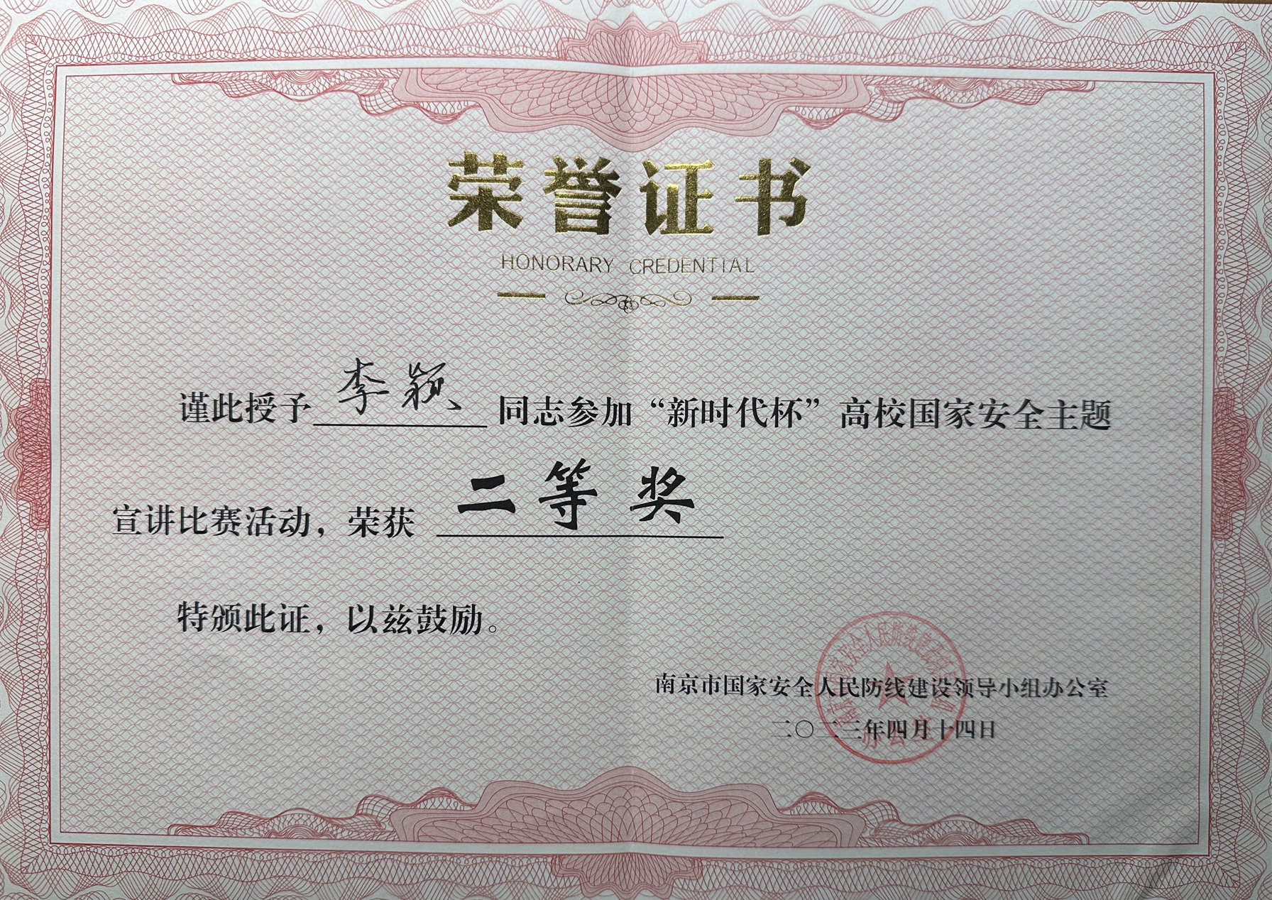 今年的4月15日,是第八个“全民国家安全教育日”。4月14日,“新时代杯”高校国家安全主题宣讲比赛在江苏警官学院进行,色情视频 思政教研部李颖老师在30名在宁高校选手中总分位列第五名,荣获二等奖。