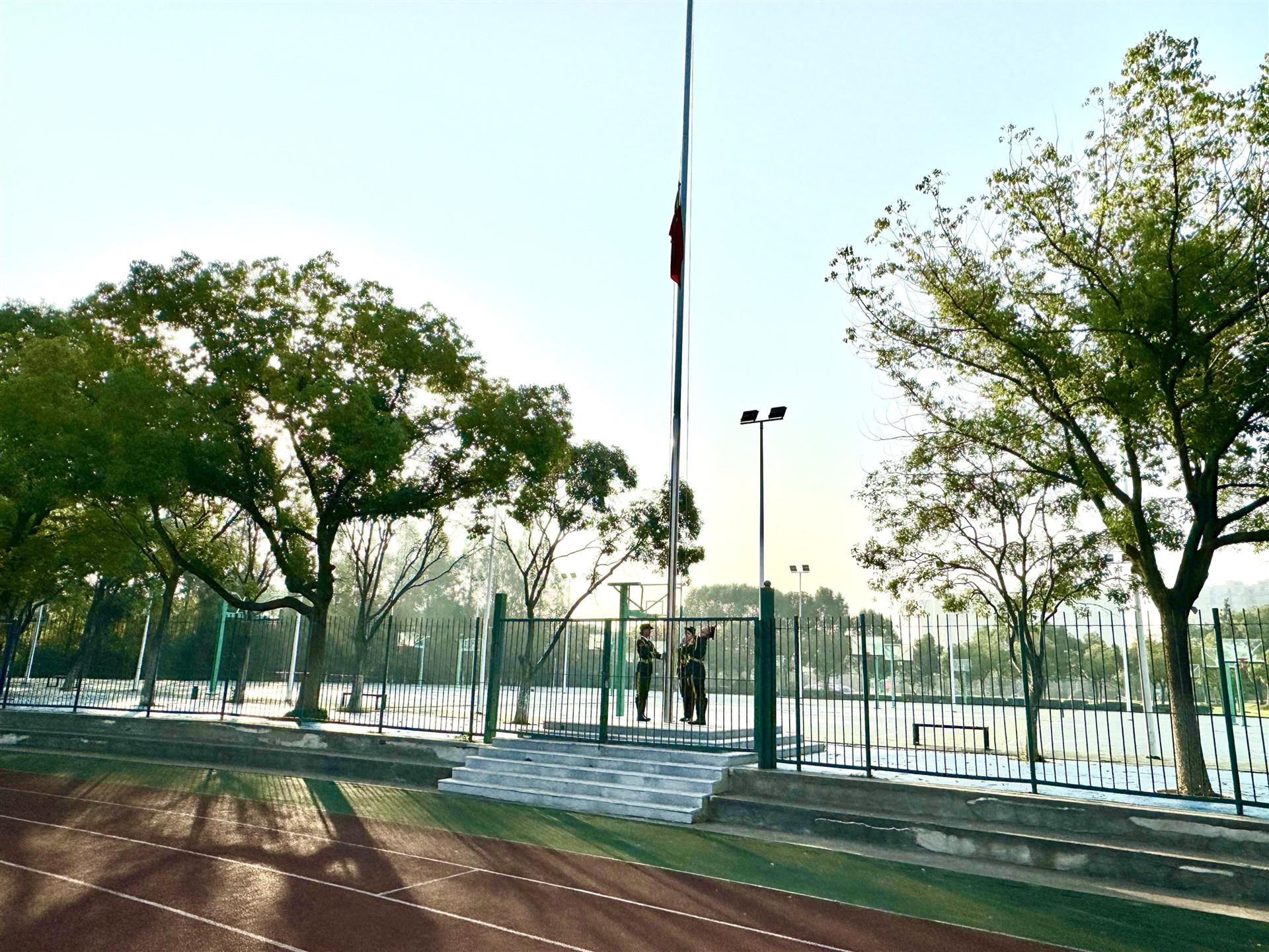 7时30分,升旗仪式正式开始。国旗护卫队迈着整齐划一的步伐护卫鲜艳的五星红旗走向升旗台,伴随着雄壮的《义勇军进行曲》,五星红旗冉冉升起,全体师生行注目礼,场面庄严肃穆。