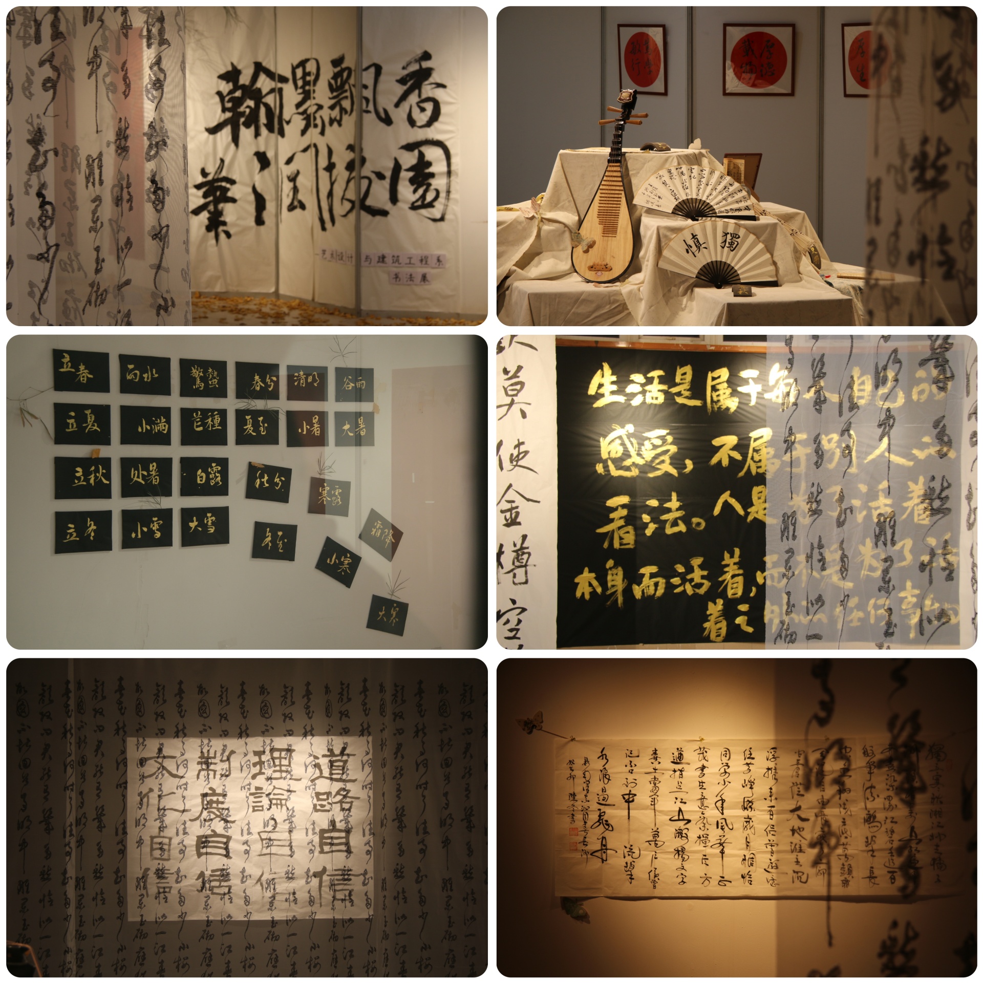 此次的作品展亮点还在于展厅的布置充分利用了艺术设计的专业特点,在专业老师庄黎的指导下,校内的一片片落叶、一根枯树枝、一个瓦片与中国的传统文化元素古琴、茶艺、画扇相融入至整个展厅设计中。