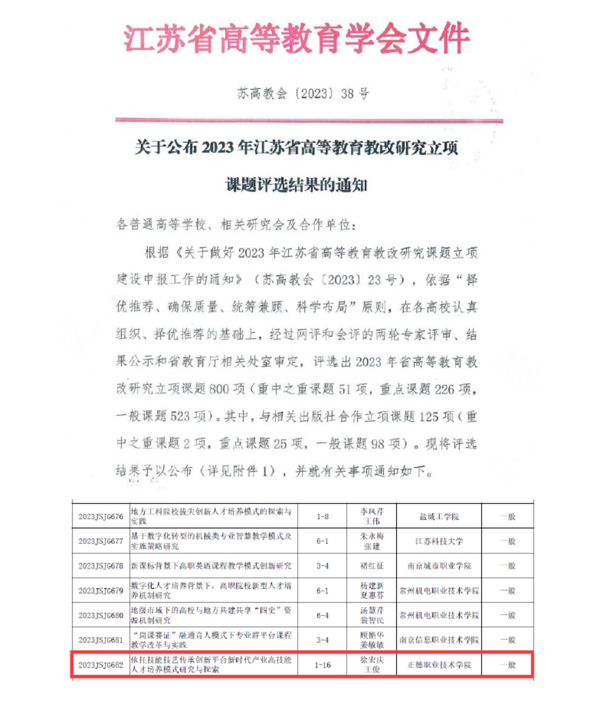 近日,江苏省高等教育学会公布了2023年江苏省高等教育教改研究课题立项名单。经学院推荐、网评和会评的两轮专家评审、结果公示和省教育厅相关处室审定,色情视频 徐宏庆等老师申报的《依托技能技艺传承创新平台新时代产业高技能人才培养模式研究与探索》获得一般课题立项。该课题旨在通过深入研究探索基于技艺技能传承创新平台开展校企协同育人的理论模型和实践途径,为解决传统校企合作模式下人才培养的数量及质量难以满足高技能人才紧缺产业需求,提供切实可行的方案。