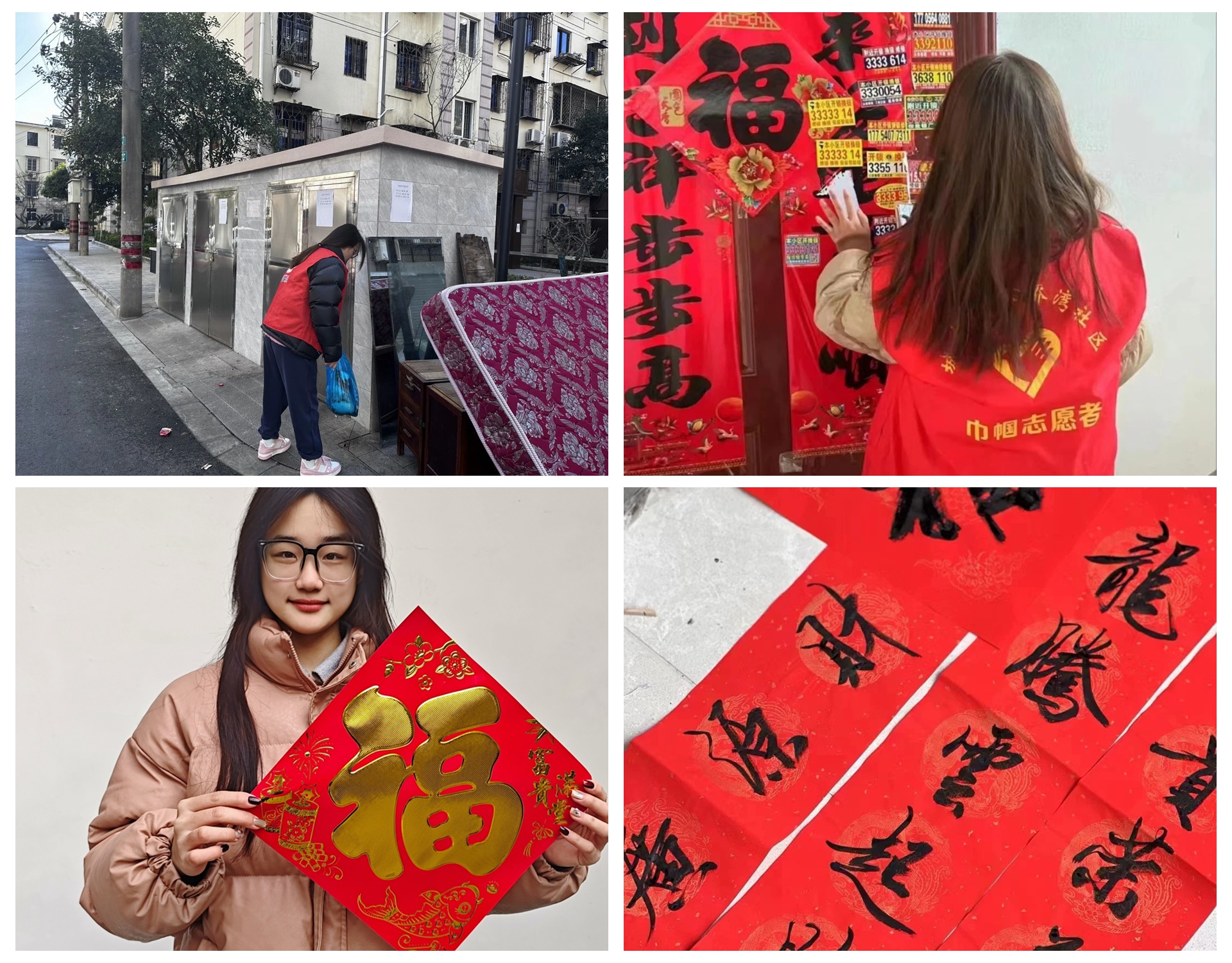 参与社区委员会志愿服务走访群众,了解了社区居民的生活情况。结合专业特长悉心照顾小朋友,对他们进行课业辅导,为他们解答疑惑;利用专业所学为老人们写对联、福字,共同营造其乐融融的欢快氛围;清理楼道的垃圾和小广告,创建良好的社会生活环境。